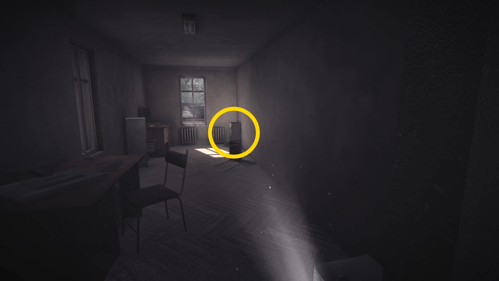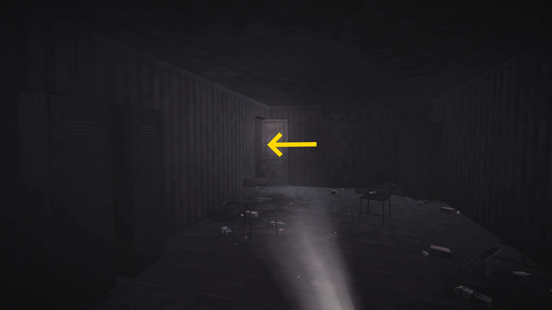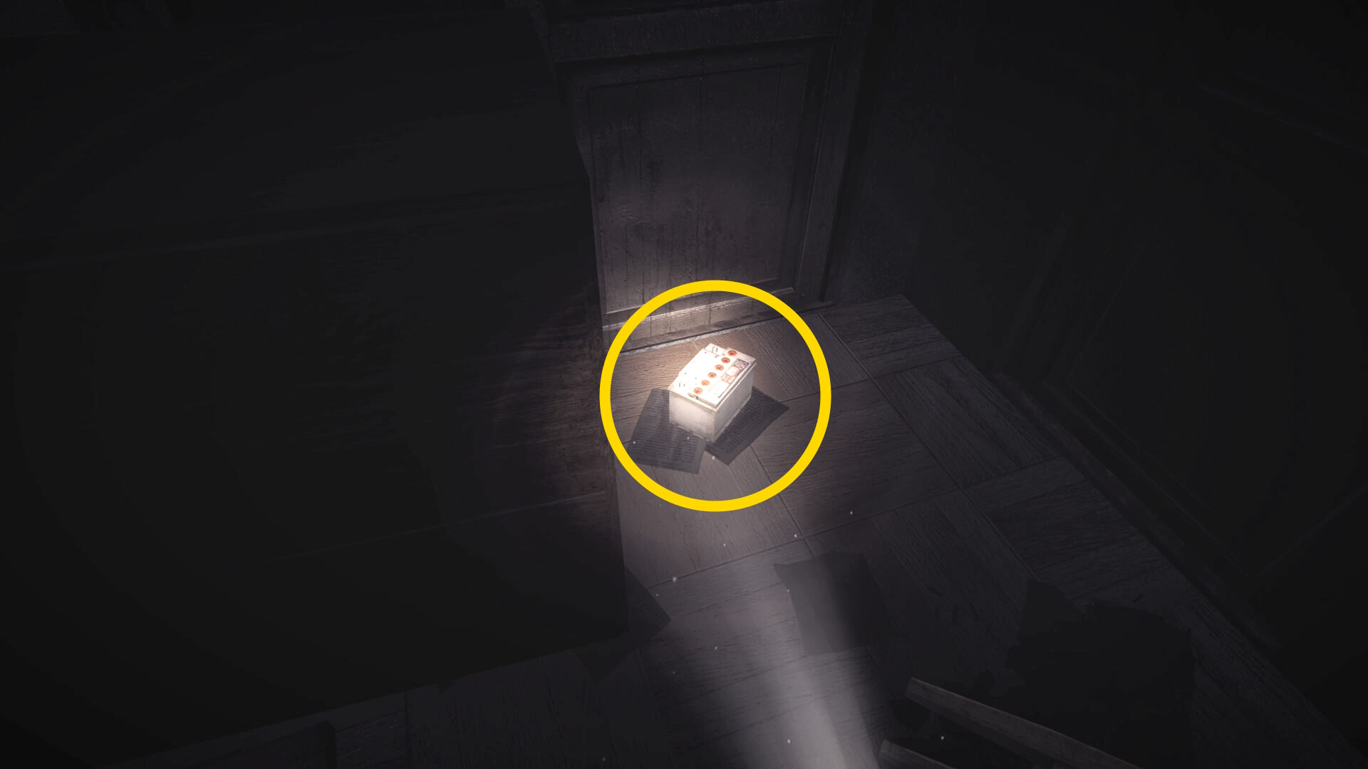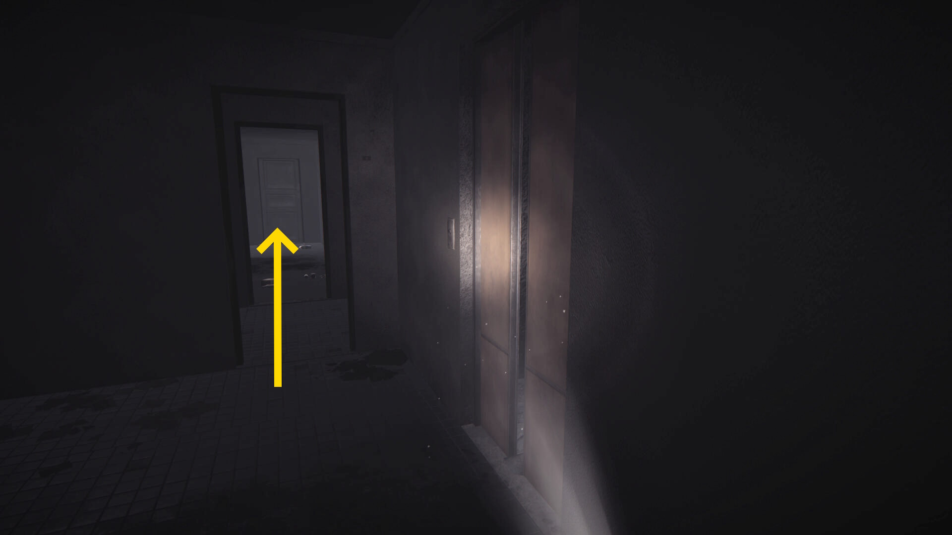 - バッテリーを回収後、壊れたエレベーターに戻る(下画像、懐中電灯の光が当たっているところが壊れたエレベーター)