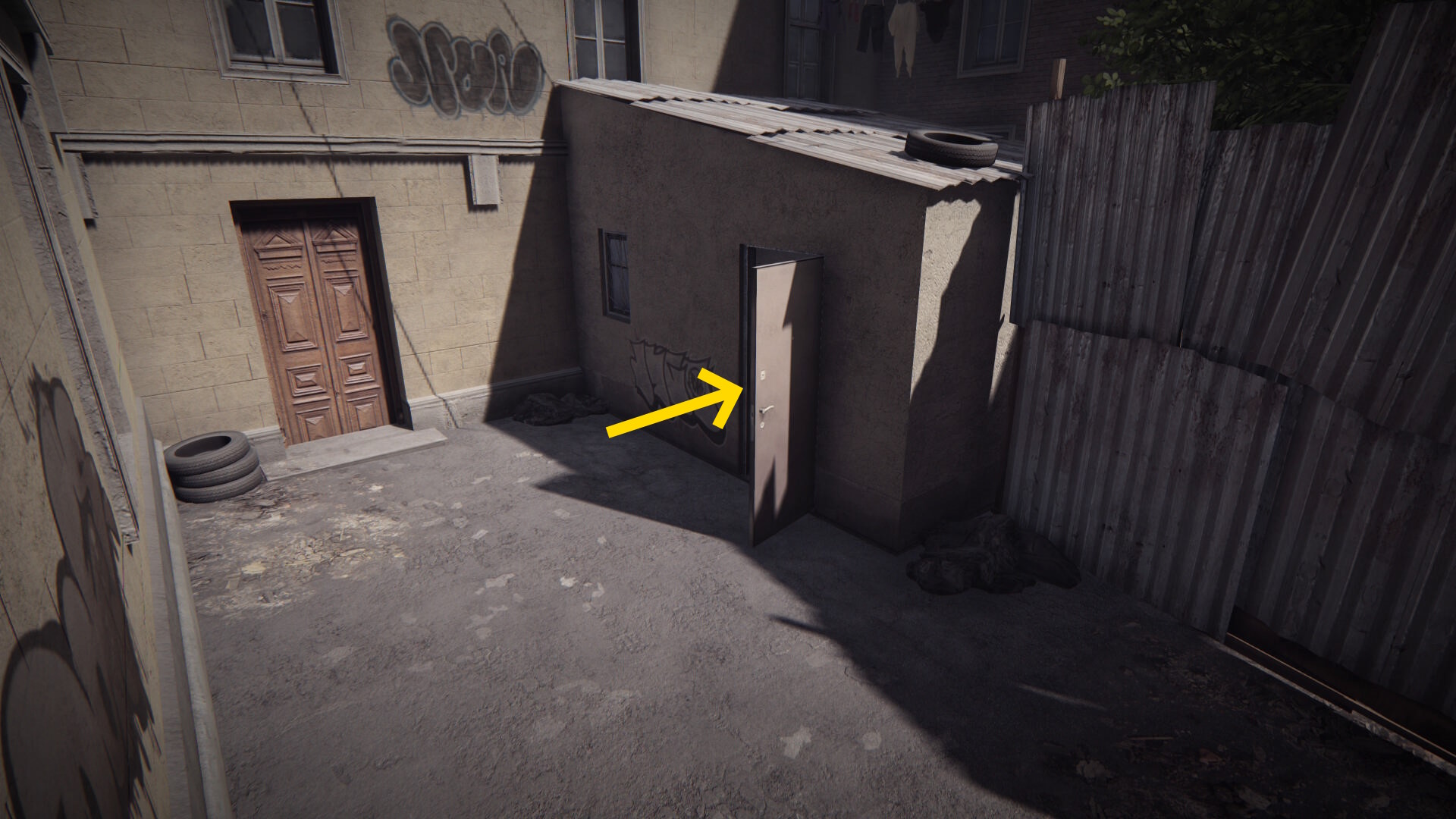 - 裏庭に出るとドアが開いている小屋がある