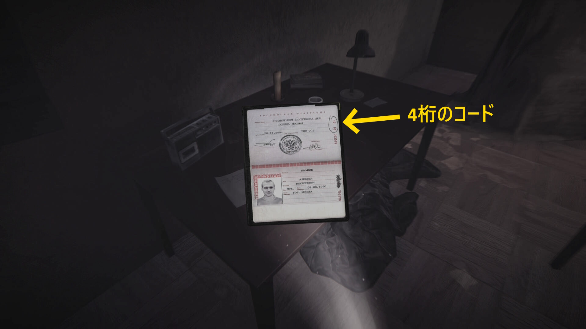 - 左の机上に パスポート があるので調べる