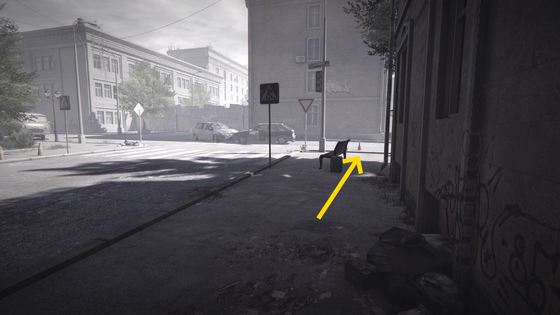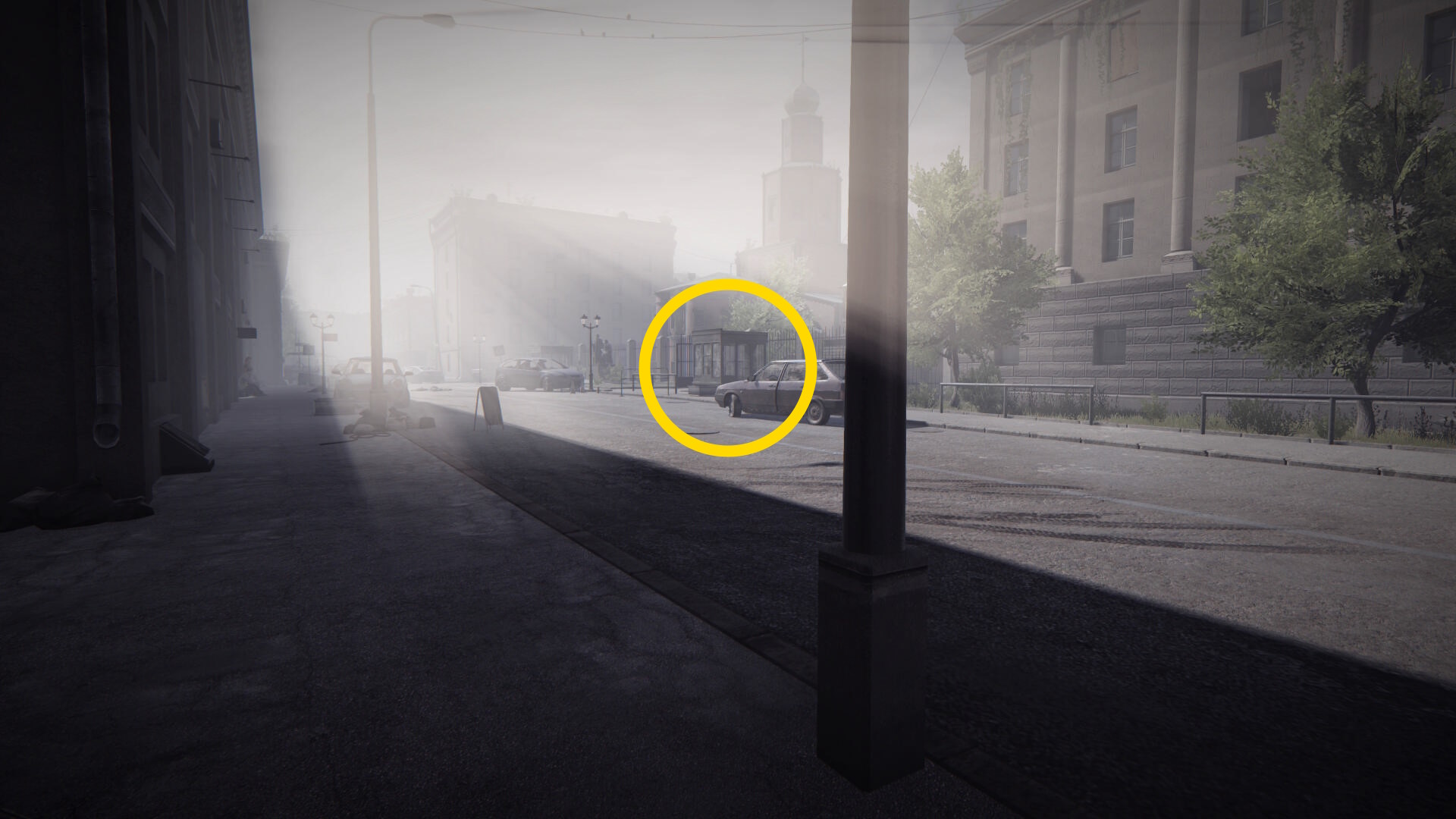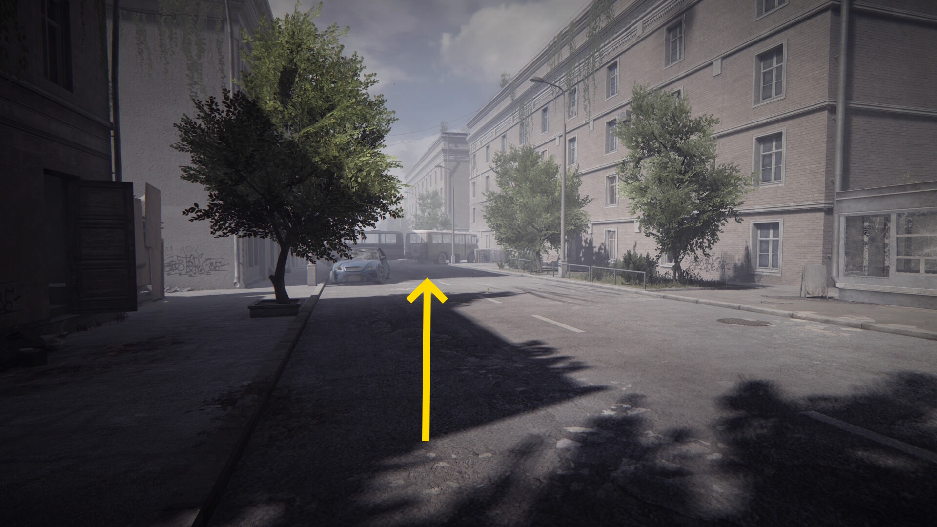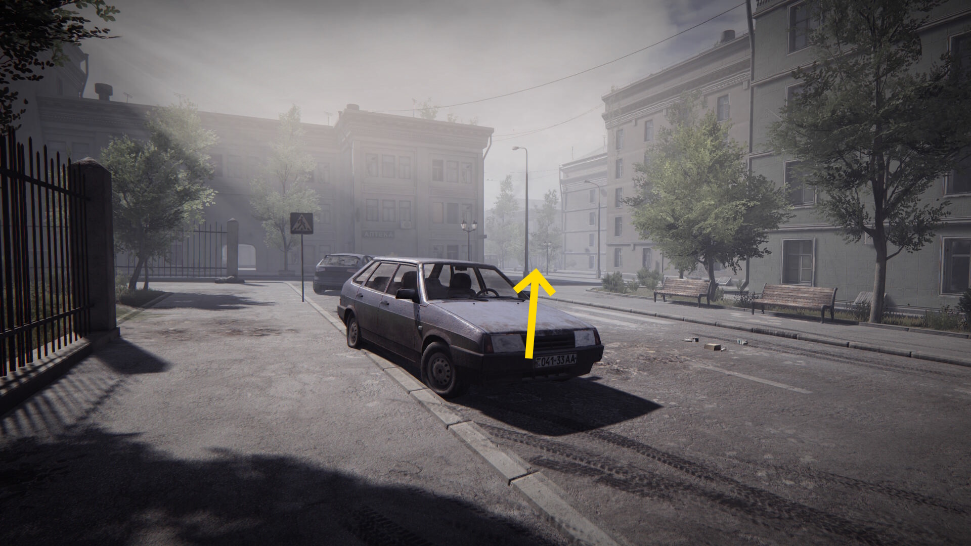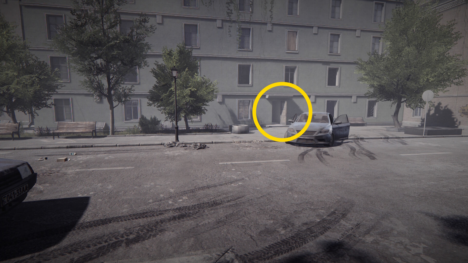 - この建物を正面に見て右に青い車があり、そこまで行ってしまうとカットシーンになってしまうので行かないこと