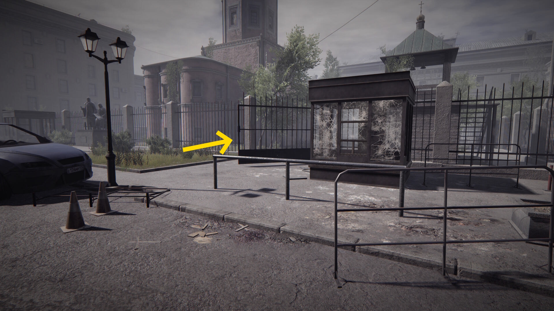 - 真四角の建物の脇、格子状のゲートが開いている