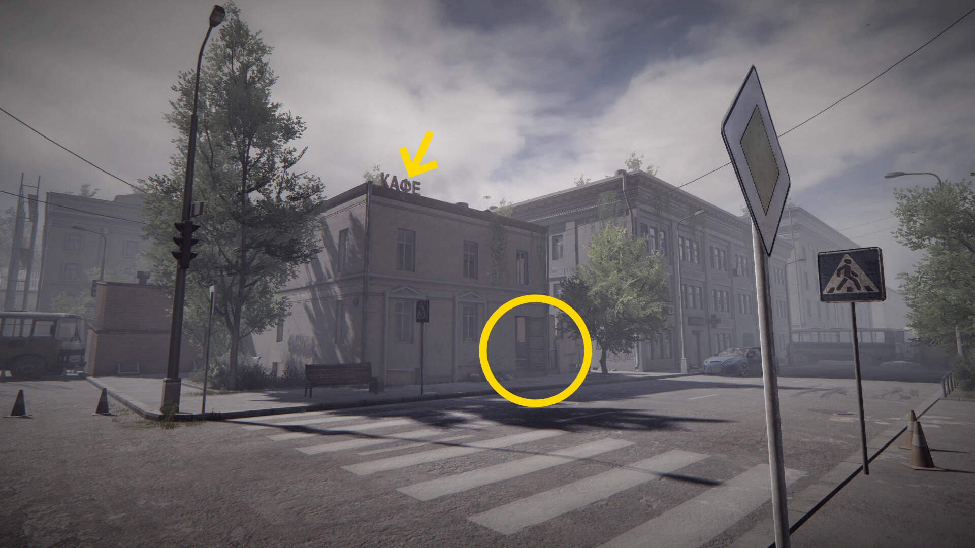 - ”KAФE” というサインのある四角形の建物があるので中に入る