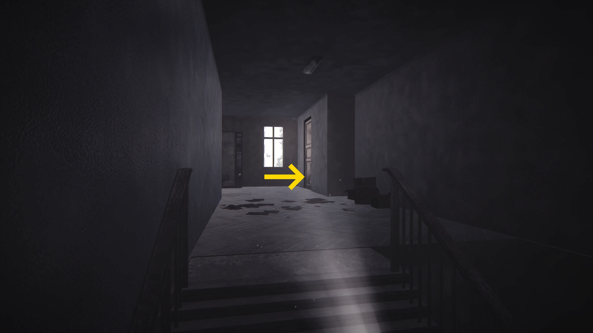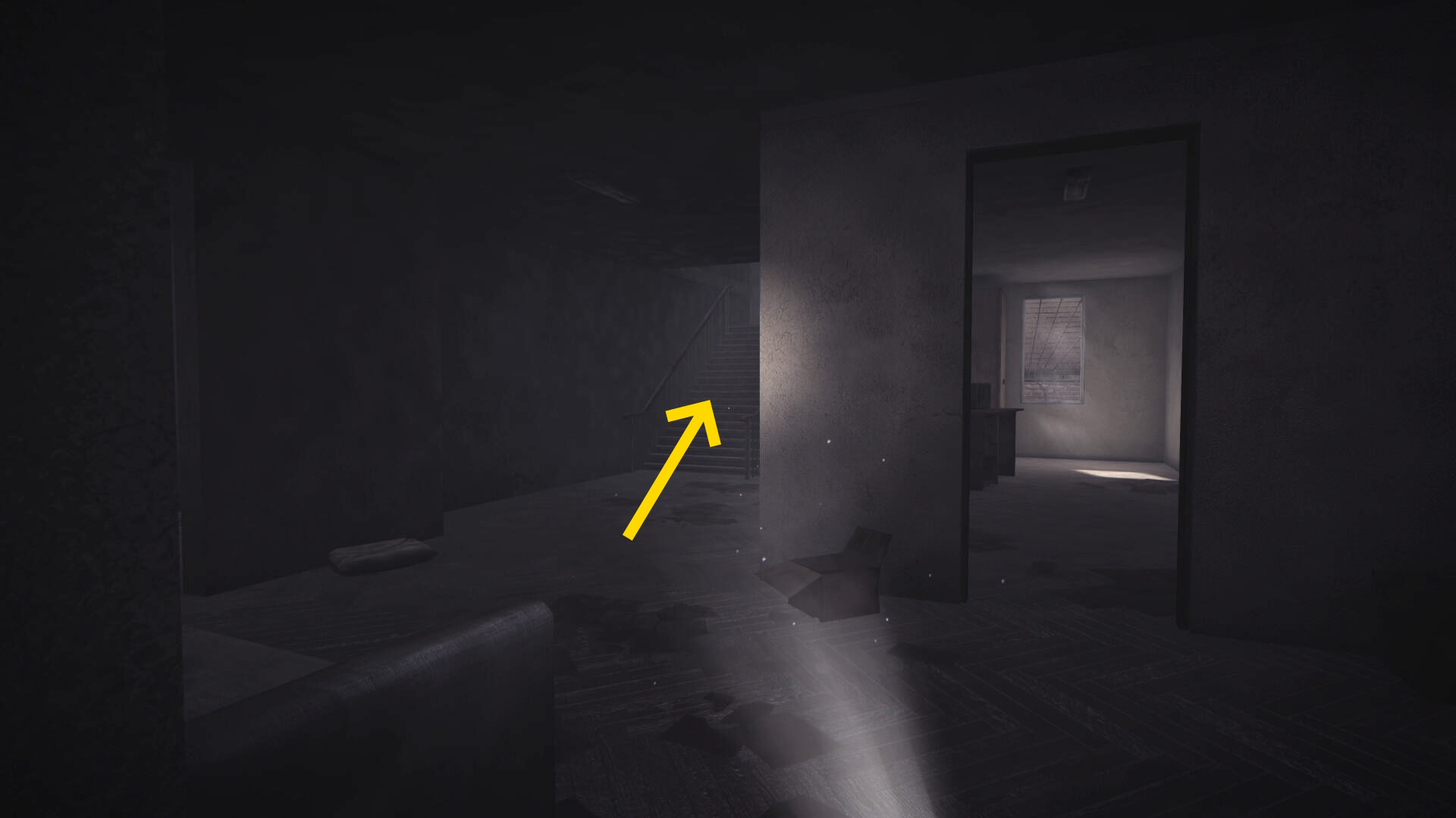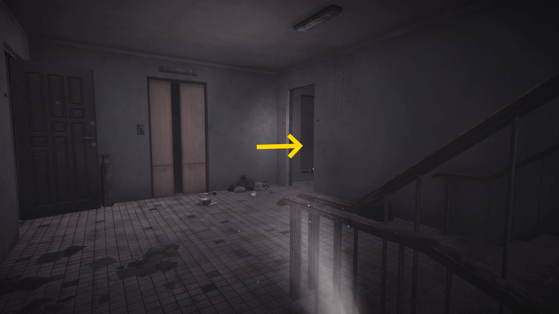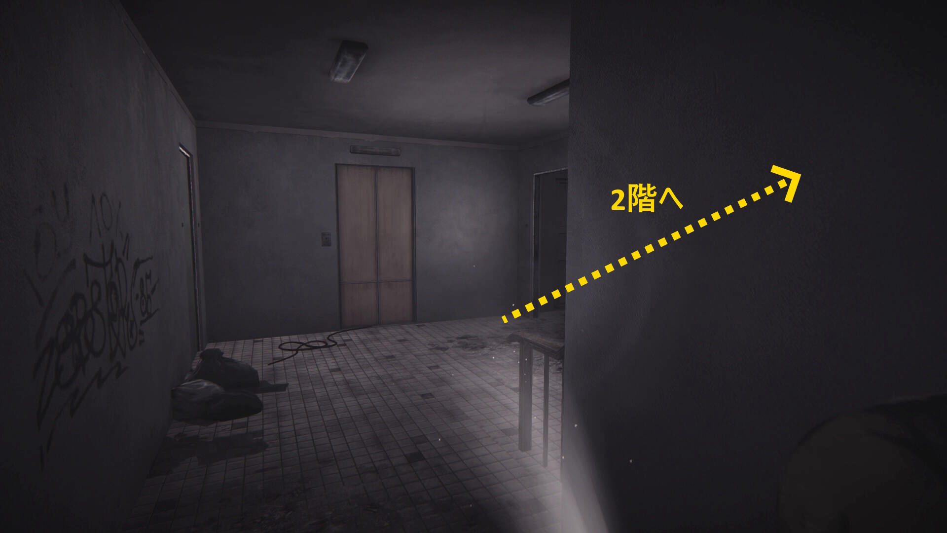 - 左の開口部は壊れたエレベーターに通じており、その逆の右に曲がる