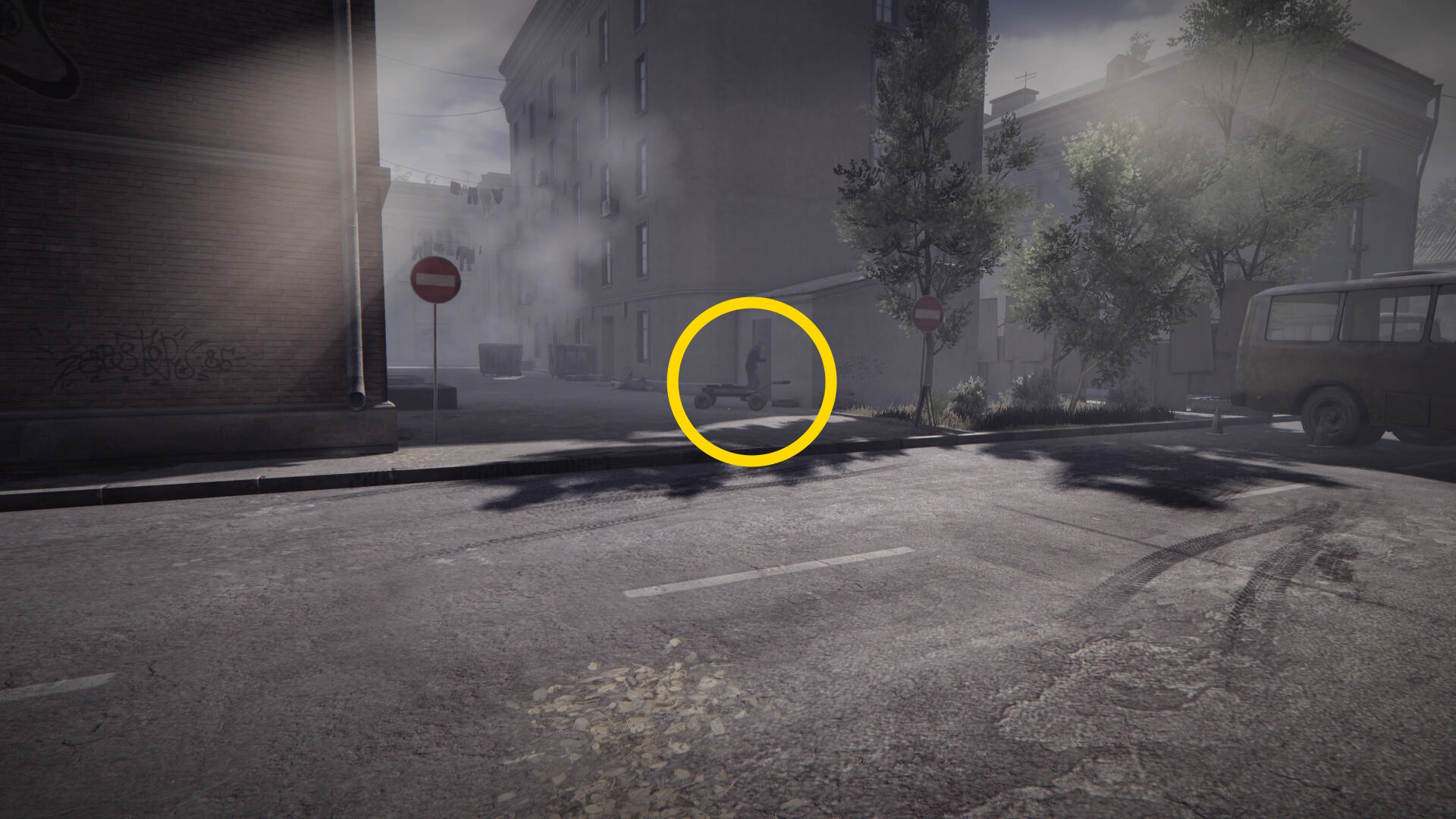 - 突き当りまで進むと、バスと救急車によって道路が封されている