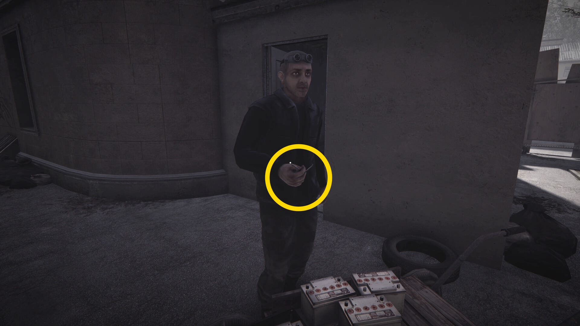 - 彼に近づくとドアにタックルしたあと、ピッキングツールでドアを開ける