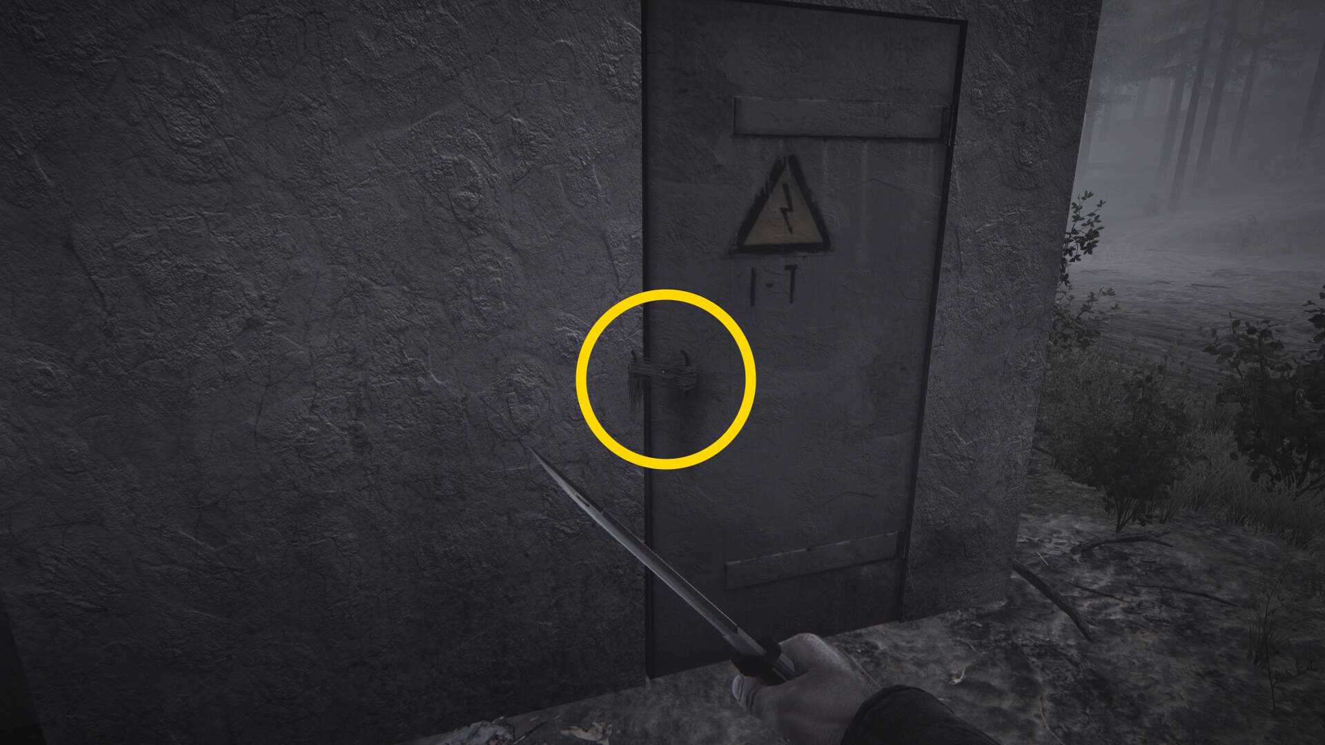 - 鉄塔のところに来たら、相棒が色々と調べている間にコンクリート小屋の ”高電圧注意” のドアを抑えているロープをナイフで切る