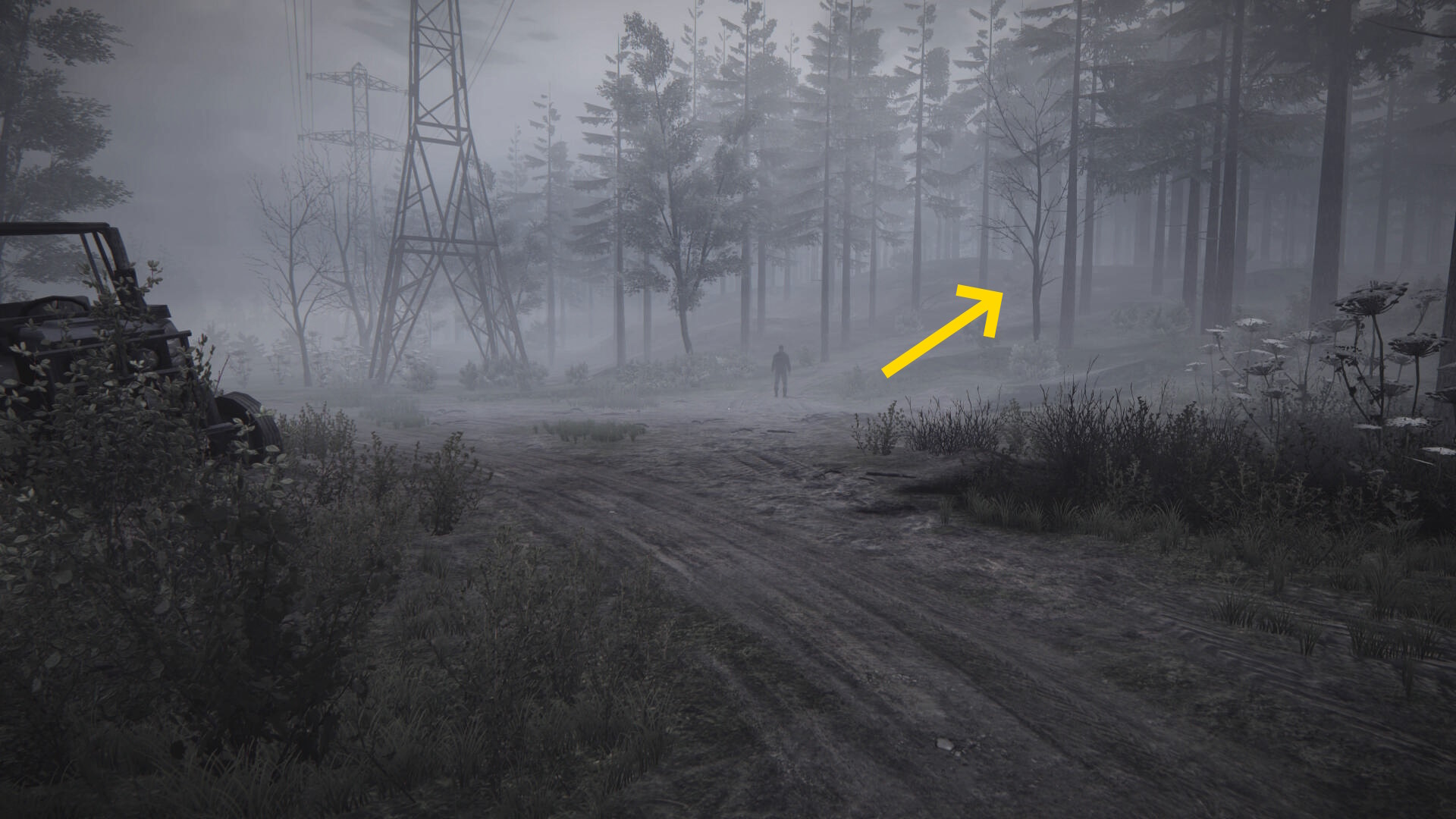 - 相棒と会話しながら、カーブが続く泥の道を下りていくと鉄塔が見えてくる