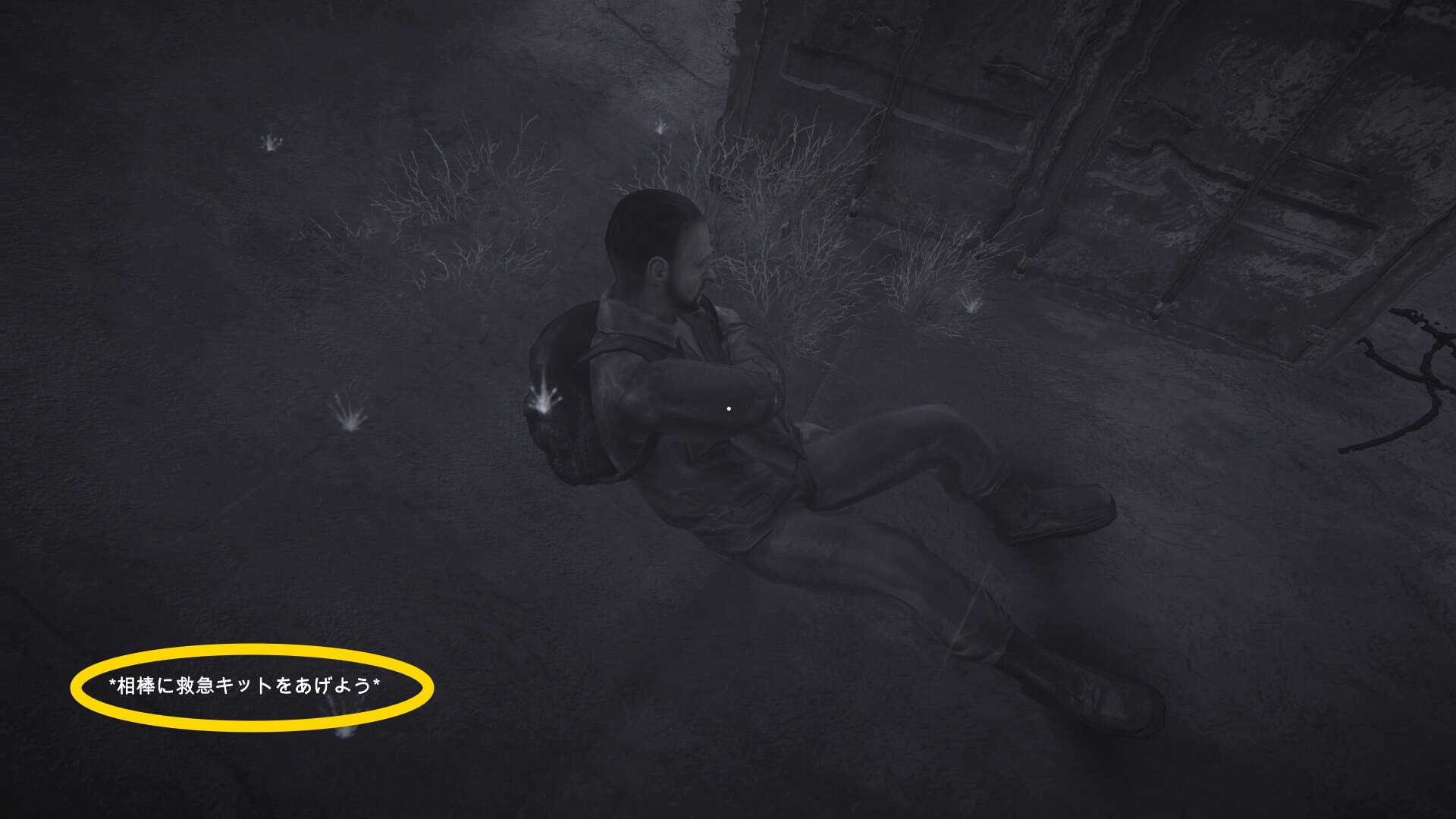 - 『救急キットを持っていないか』と聞かれるので、2周目は応急処置キットを渡す と 実績「Friend」解除(モラルポイント:16/24)