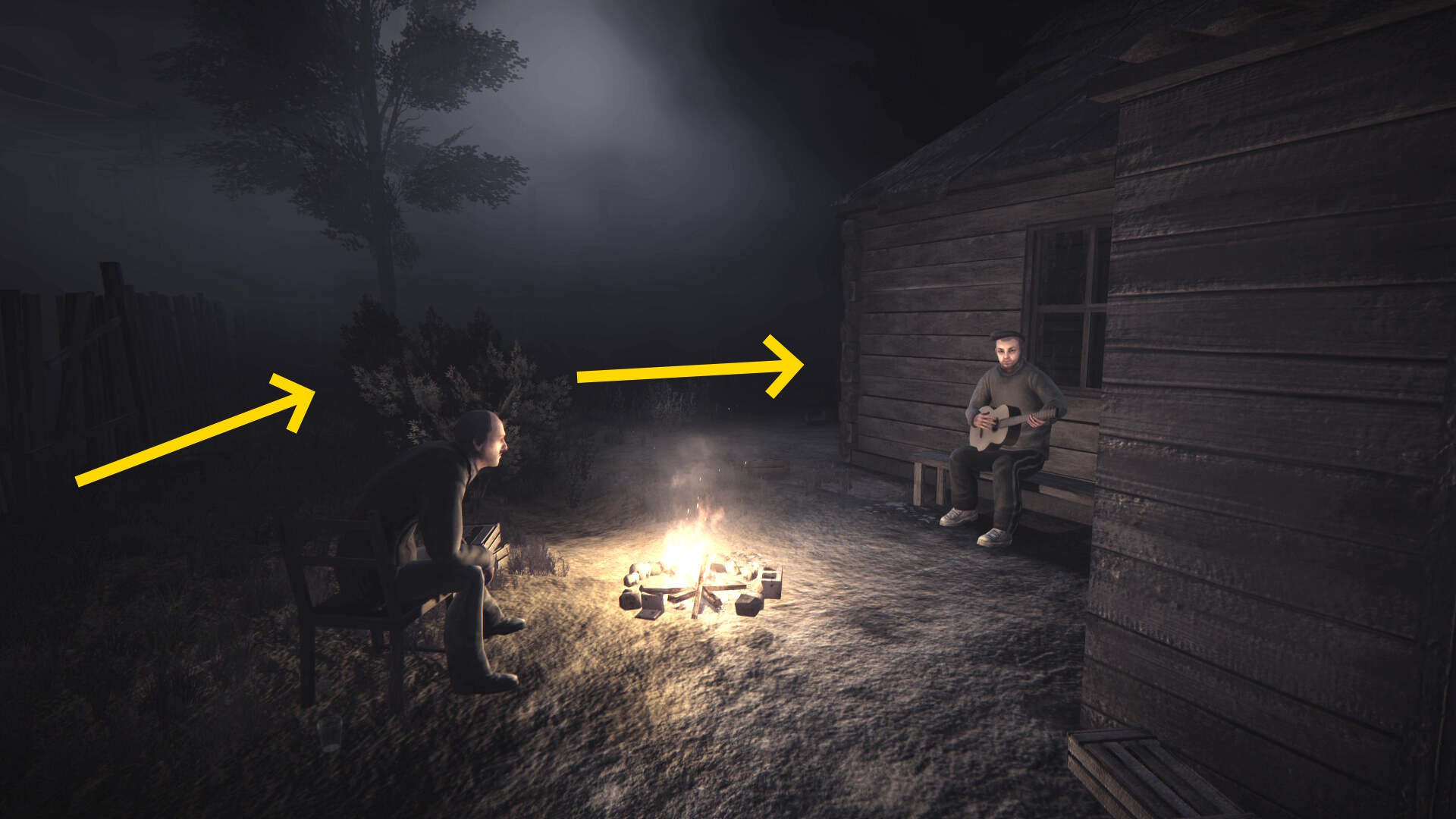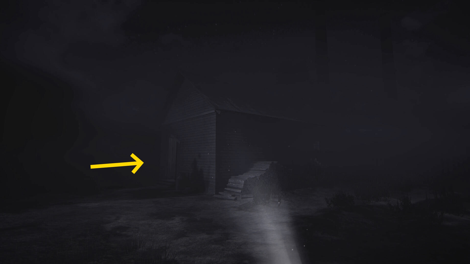 - 暗いが右前方に納屋が見えてくる(外に積まれた薪も目印になる)