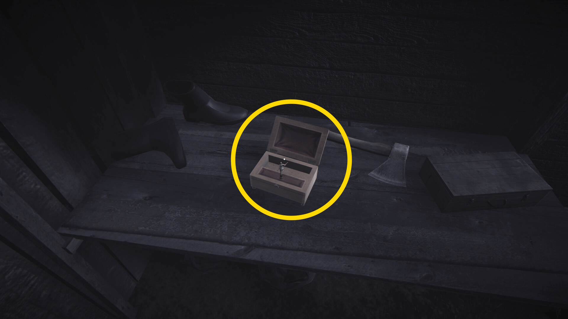 - 納屋の側面に棚があり、そこに置かれた オルゴール を調べる(モラルポイント:11/17)