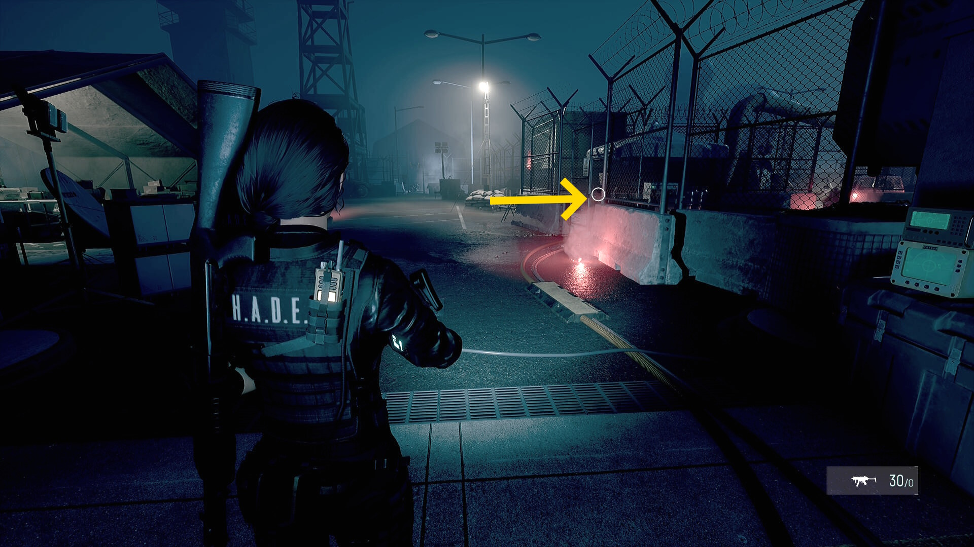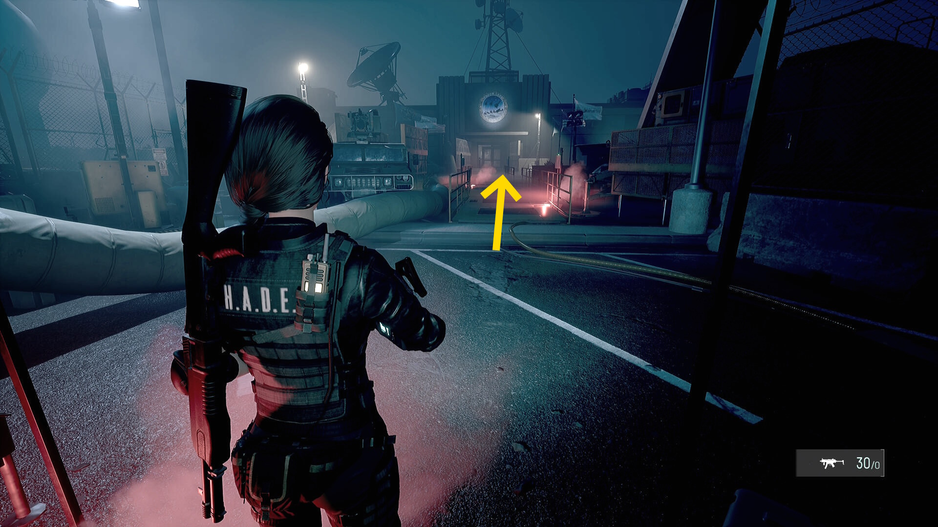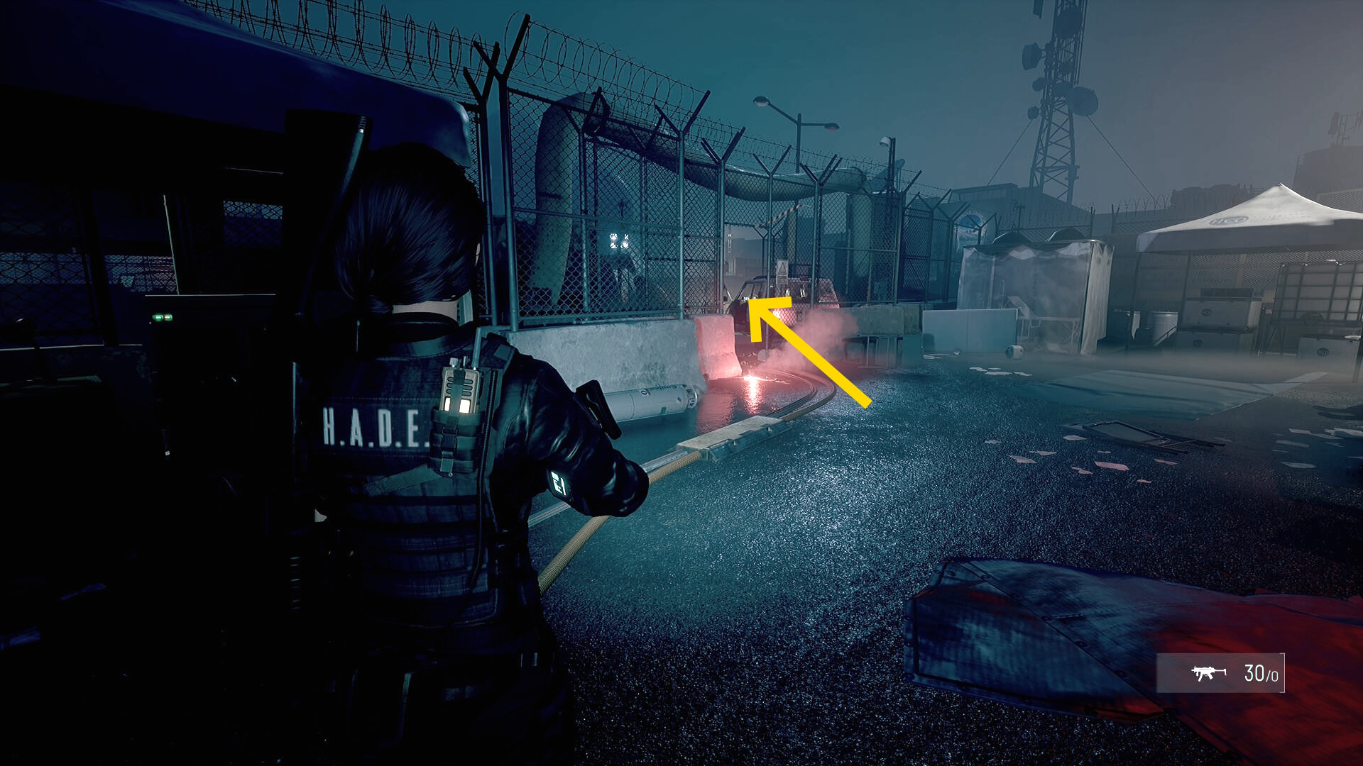 • フェンス状ドアを通過したら、左前方の開口部へ(発煙筒があるところ)
