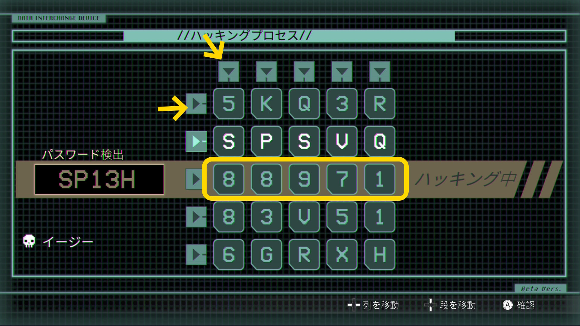 • 次に段(縦方向)と列(横方向)を A ボタンを押して動かし(下画像:矢印)、該当する英数字を合わせていく