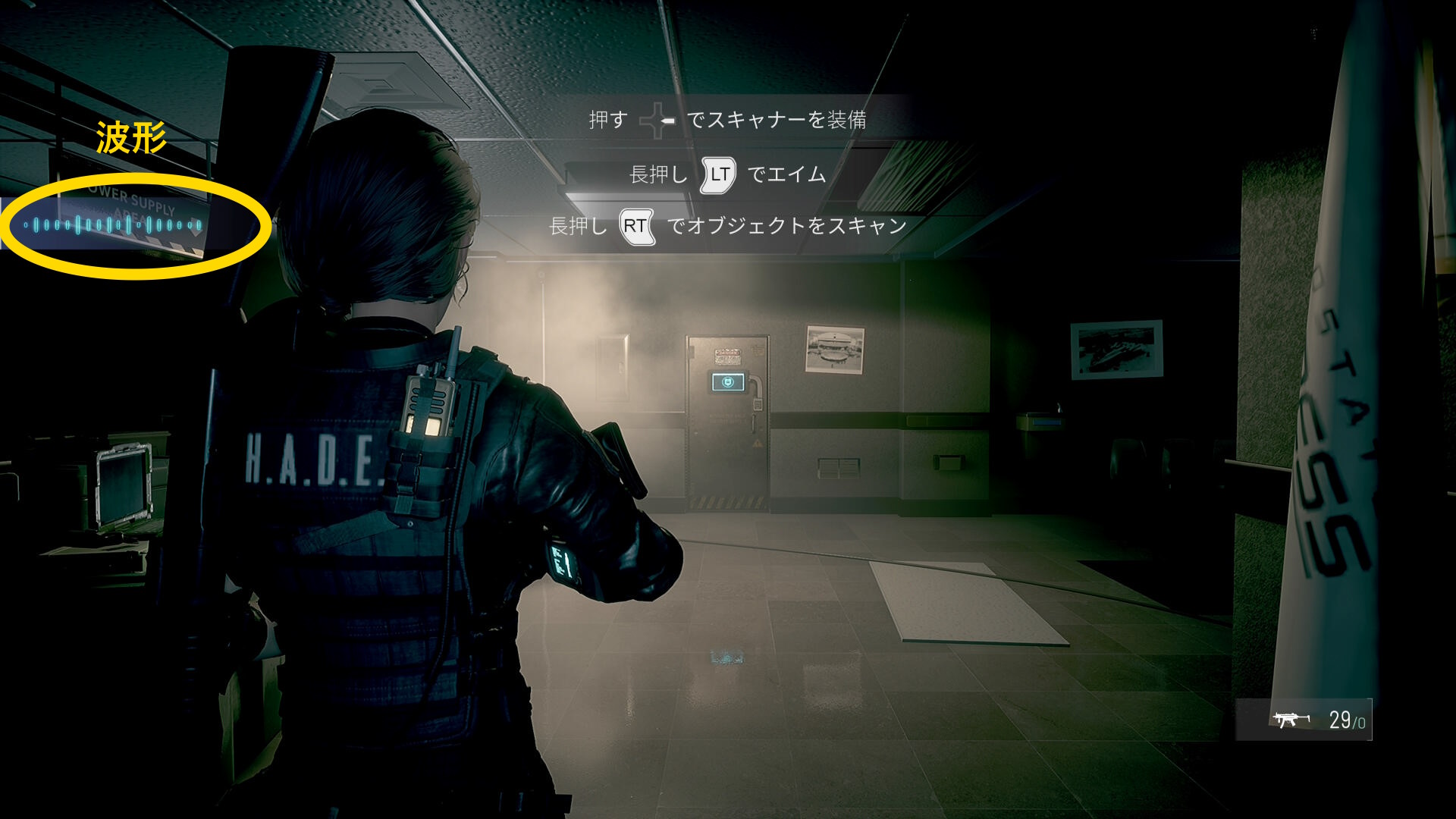 • 右に戻り、さっきまで閉じていたシャター付近に近づくと画面左上に波形が出現する(下画像)