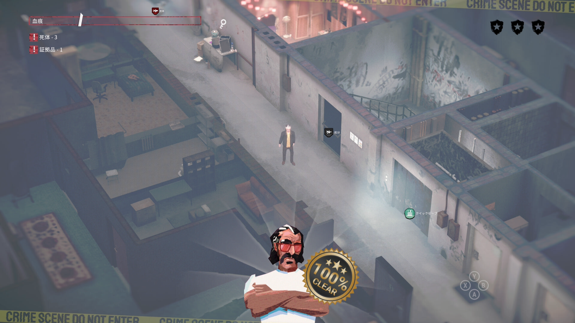 完璧な掃除ができると画面下部に 100% CLEAR の表示が出る。この状態でミッション内の仕事(死体を片付ける/証拠品を回収する)を終えると実績が解除される。血痕をすべて片付けた瞬間に解除されるわけではないので注意。