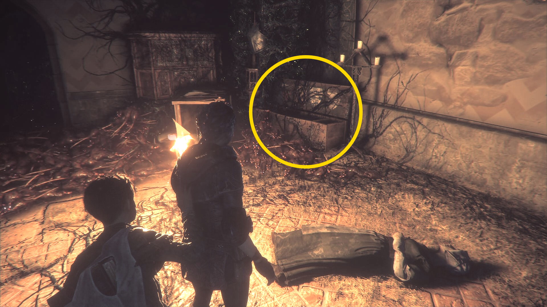 - 光線装置を左に動かすと松明の下で瀕死の衛兵がいる。手前左の木箱に 硝石、エピサングイス