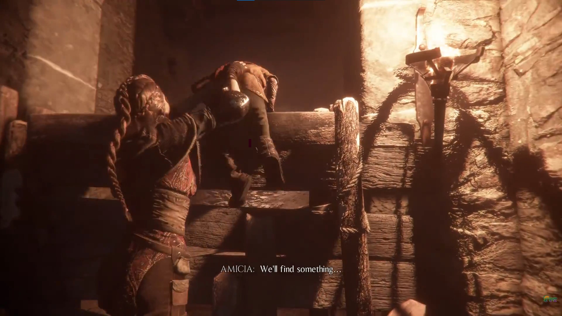 • 左前方奥の壁に松明を設置し(下画像)、その右脇のバリケードをよじ登る