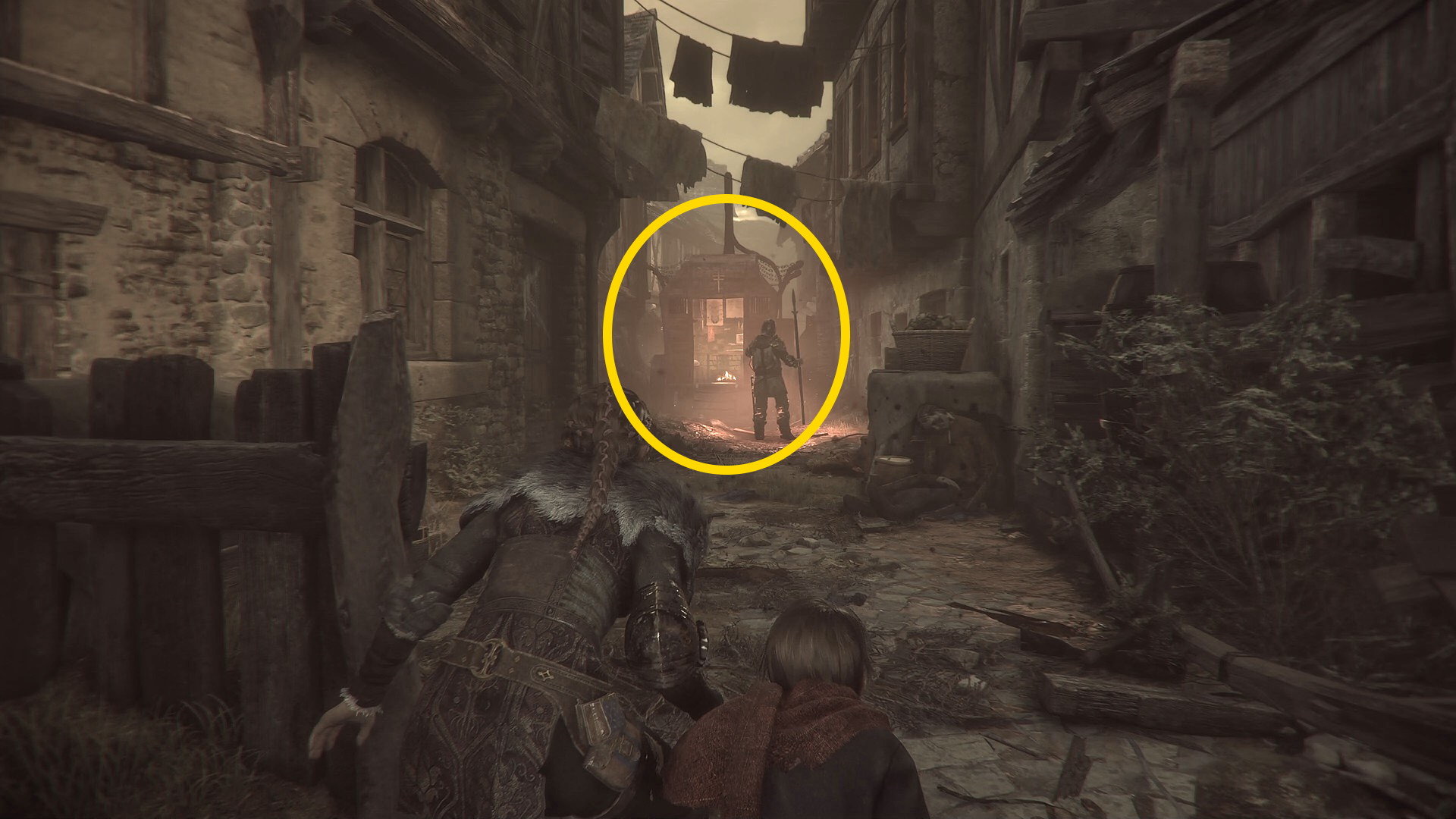 - 右前方にランタンが灯っており、そこを右折して路地の突き当りに 錬金術師の荷車 (5/5) (手前にいる衛兵はロドリックにキルしてもらう)