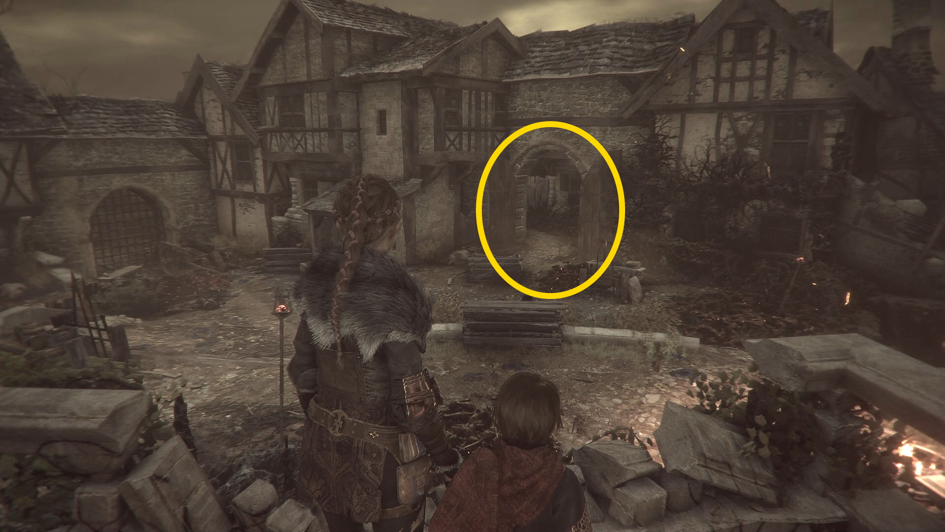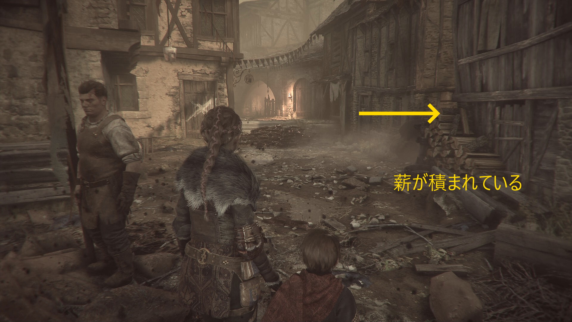 - 餌食になった衛兵2人の手前、薪が積んであるところを右に入っていく