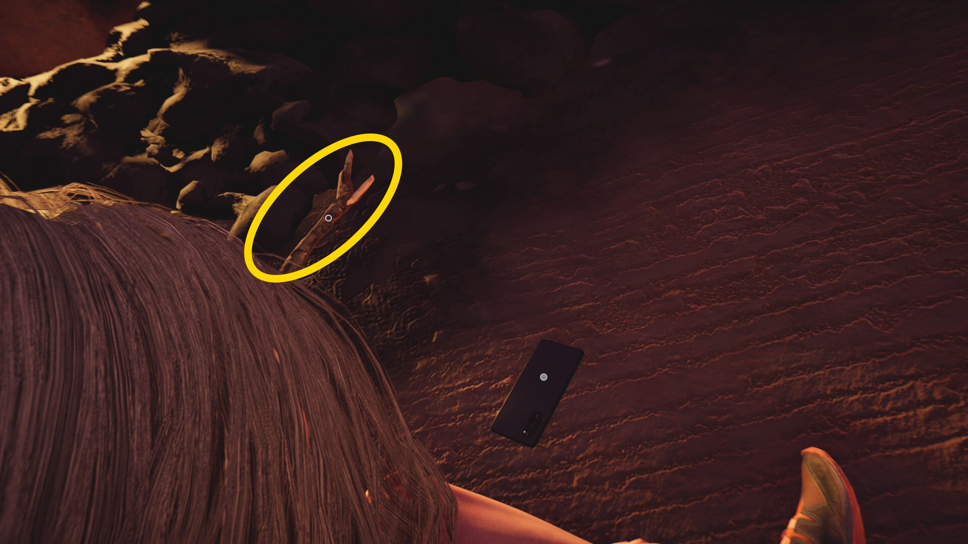 - LS を下に入力し、石を足首に3回打ち付けるとミッション目標「 Appeal to his sense of compassion 」クリア