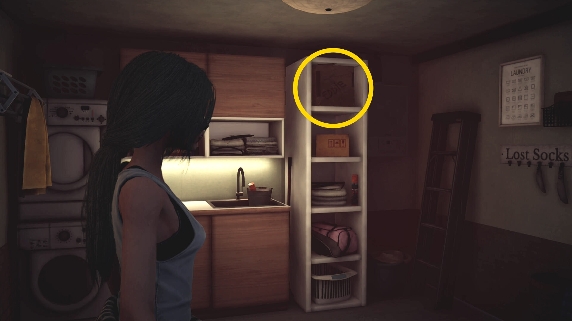 - 中に入って左側、棚の上段に入っている箱を調べる(LSRS を下に同時入力)