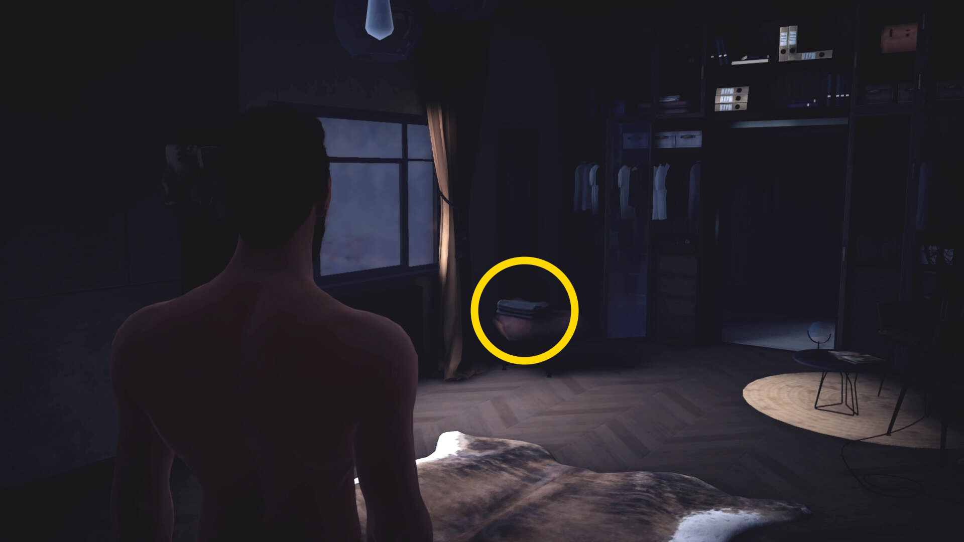 - ベッドから起き上がり、窓の近くに置かれた服を着るとミッション目標「 Get dressed 」クリア