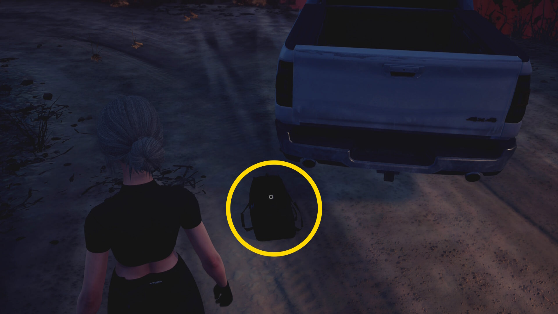 - 車のトランクに向かい、LSRS を上に同時入力してダッフルバッグを下ろす