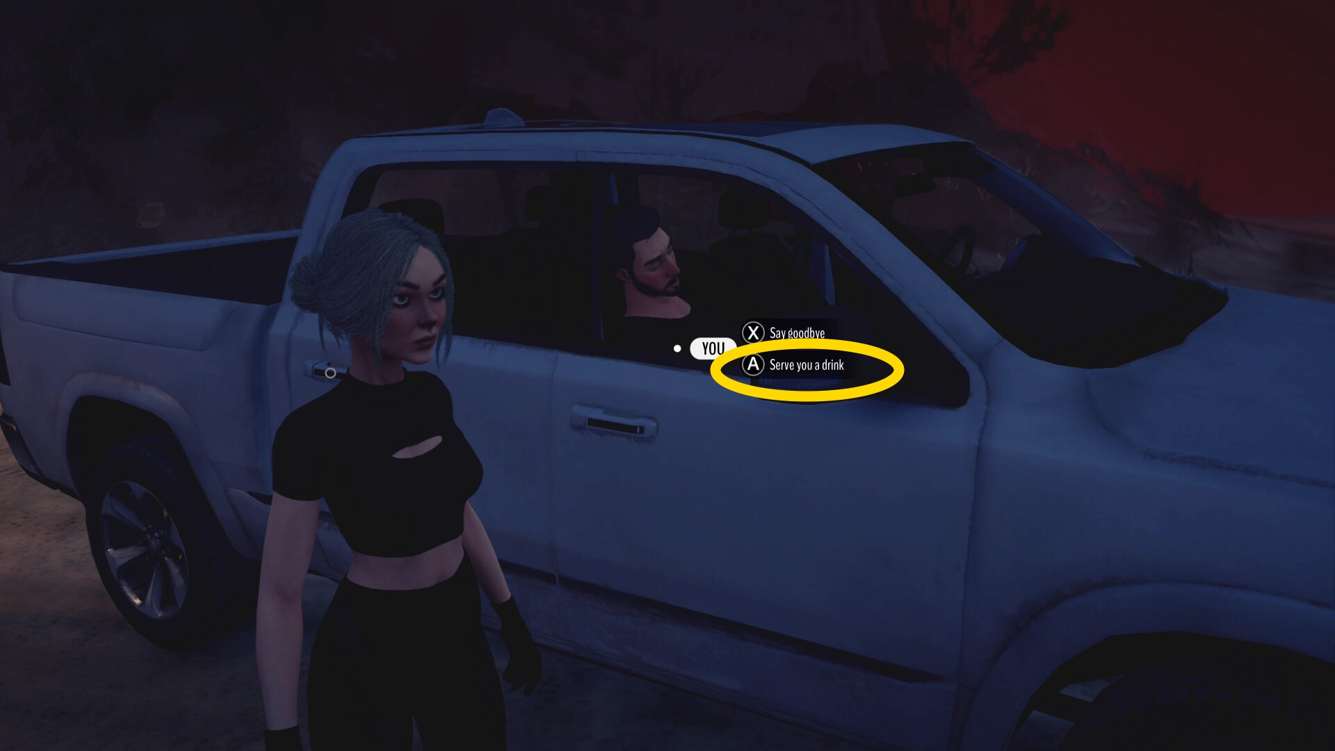 - 助手席のエドのところに向かい、選択肢「 Serve you a drink 」を選び、LS を下に入力してウイスキーをエドにぶっかける