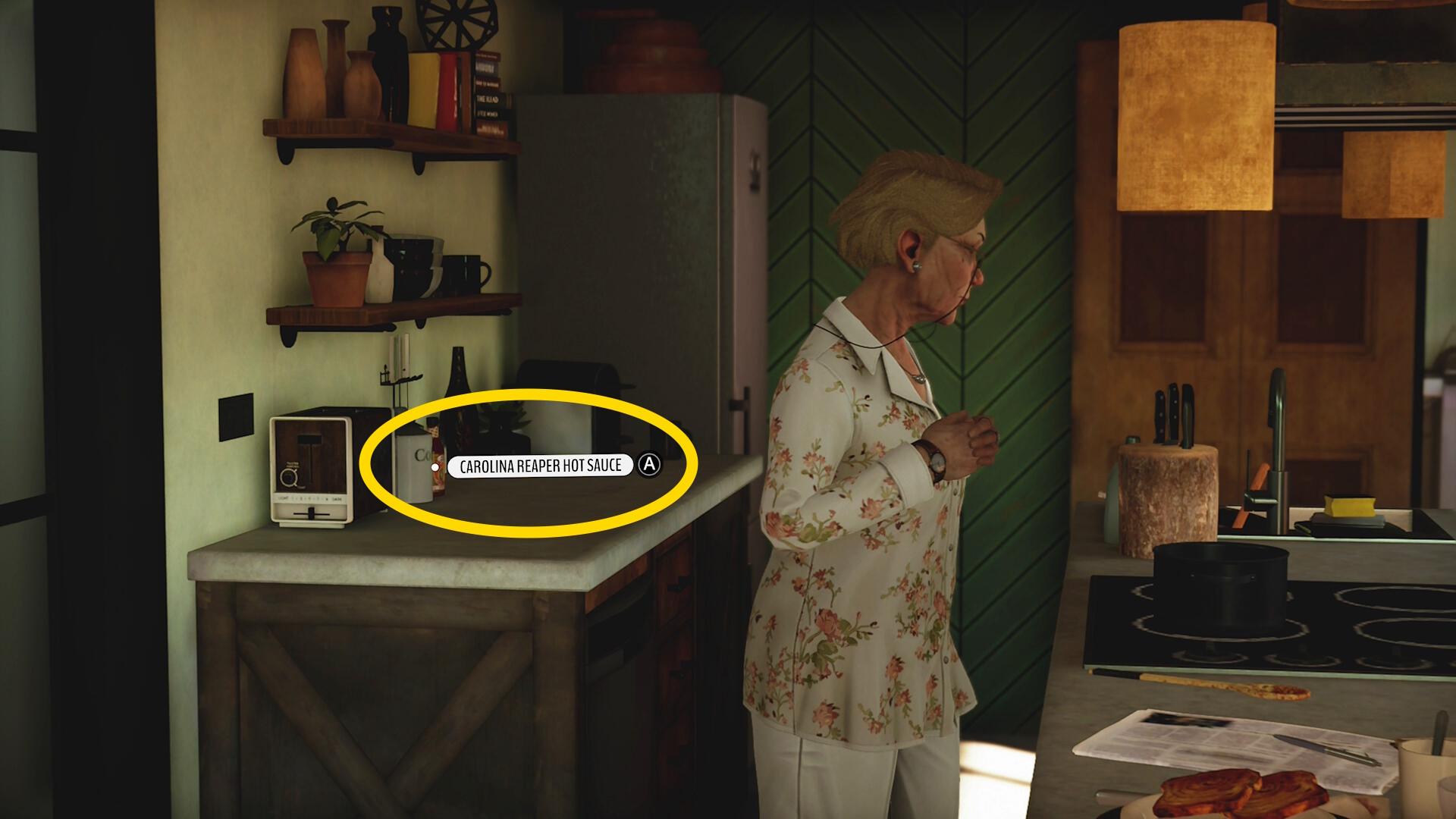 - 会話中、おば がソースを探すので彼女の後ろにある「キャロライナリーパーホットソース」をみつける