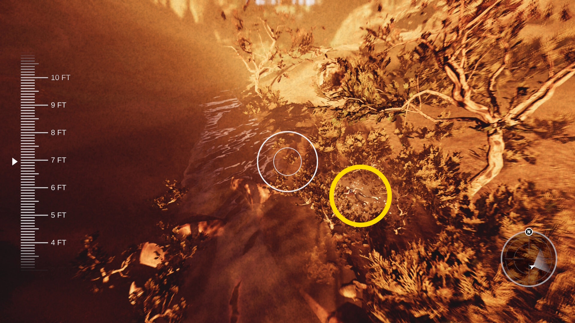 - 西日がまぶしいので、それを背にして降下していくと渓谷の底に木が見え、その左側にフェイの遺体が見える(川の右側)
