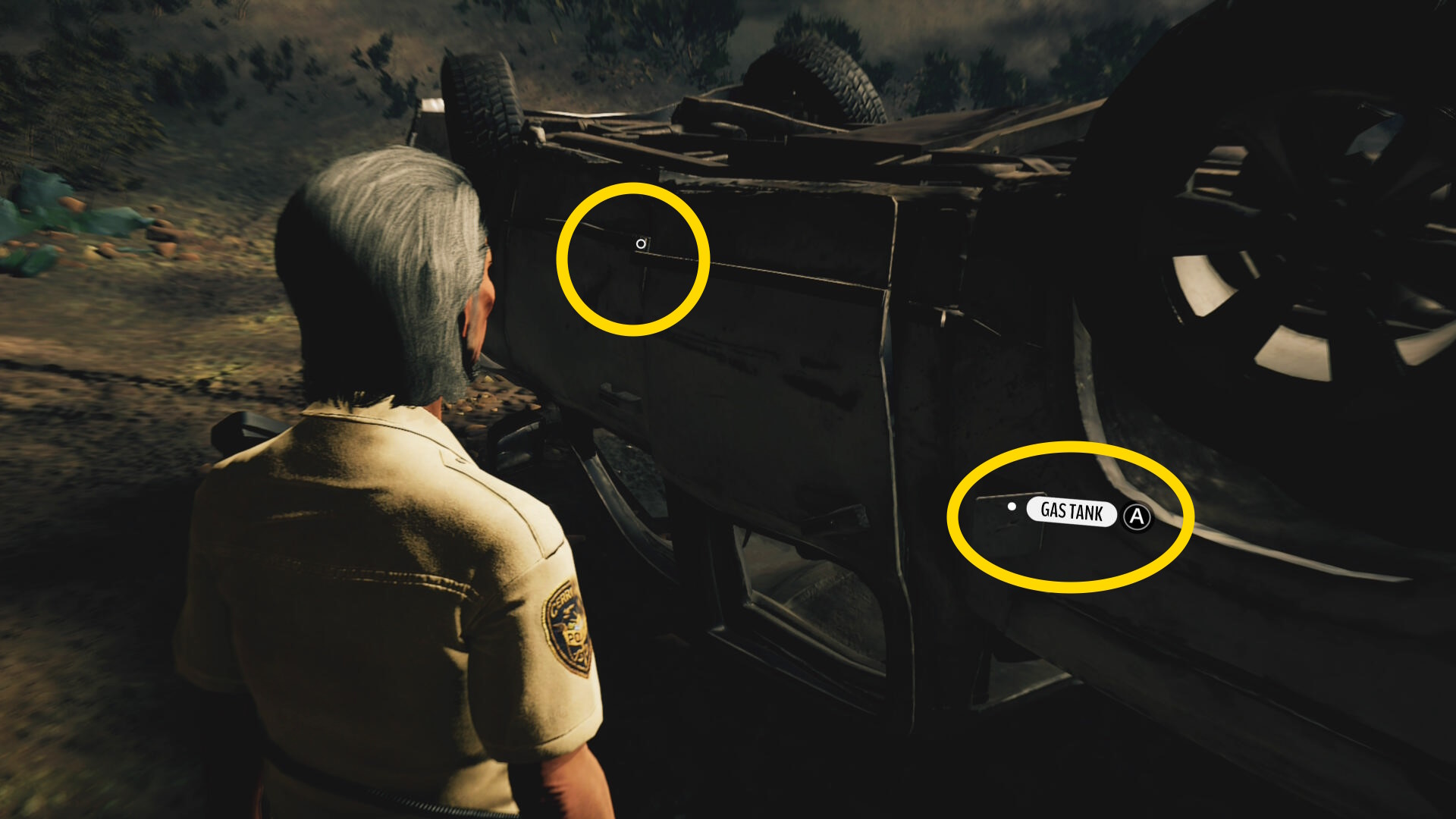 - カットシーンが終わったら、大破した車の「ガスタンク」と「ドア」を調べる