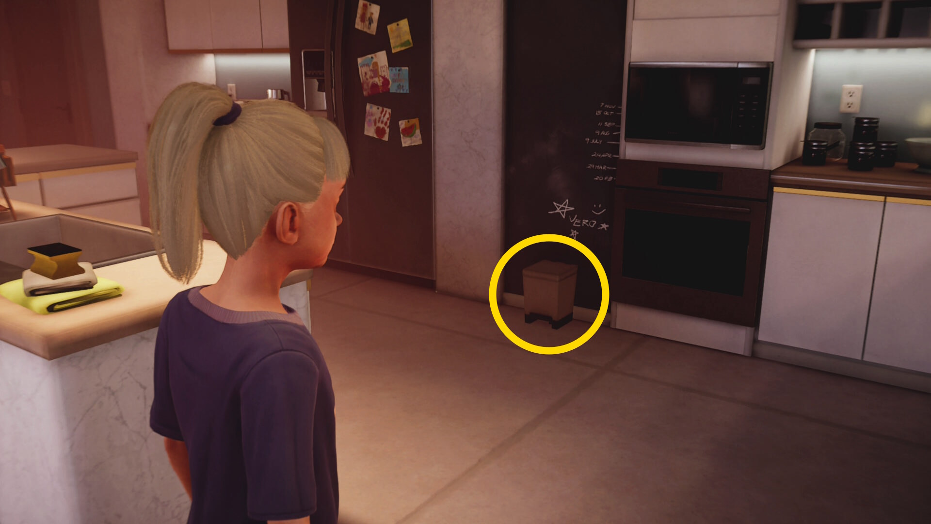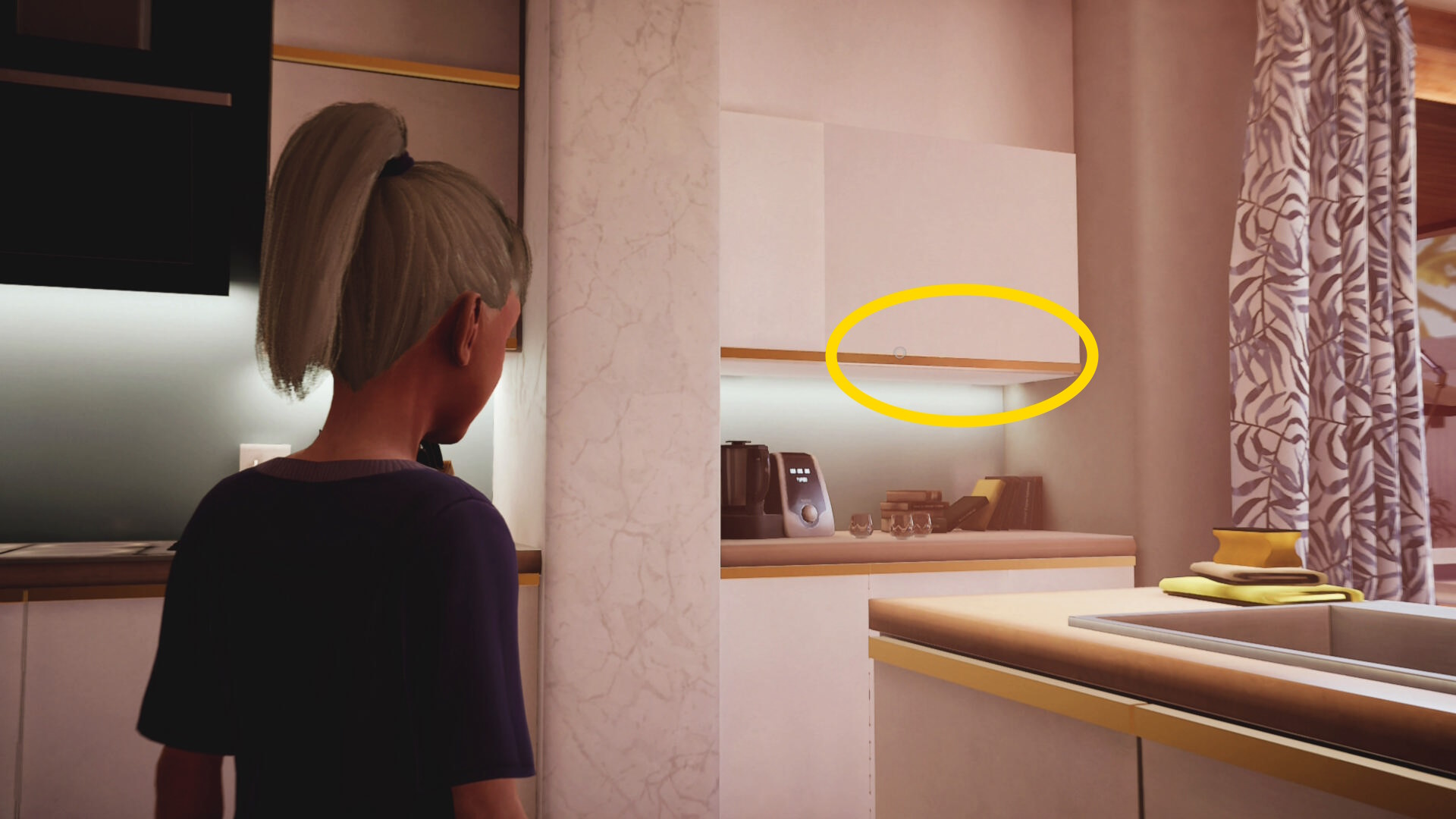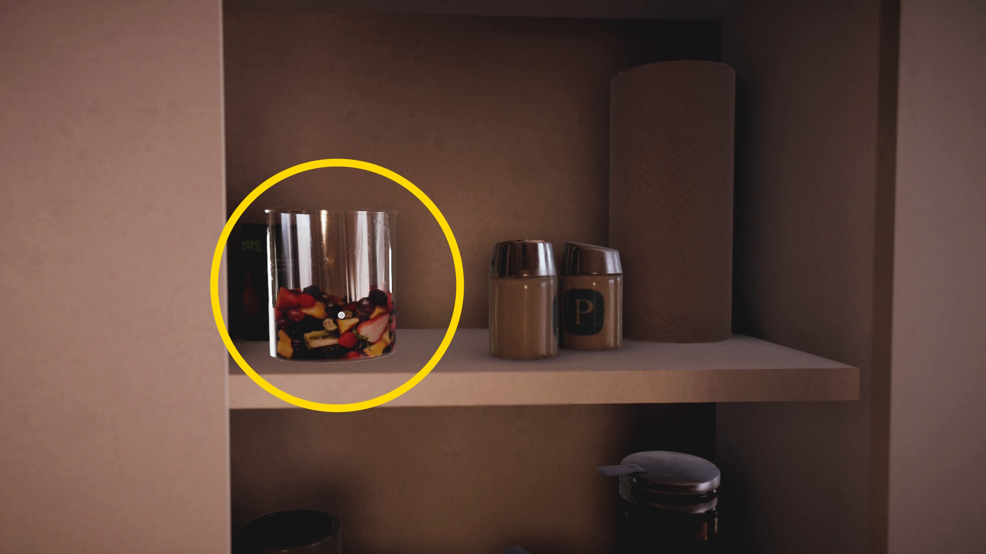 - LS を左に入力して食器棚の扉を開け、フルーツ柄のグラスを動かす( LS を上~右に入力)