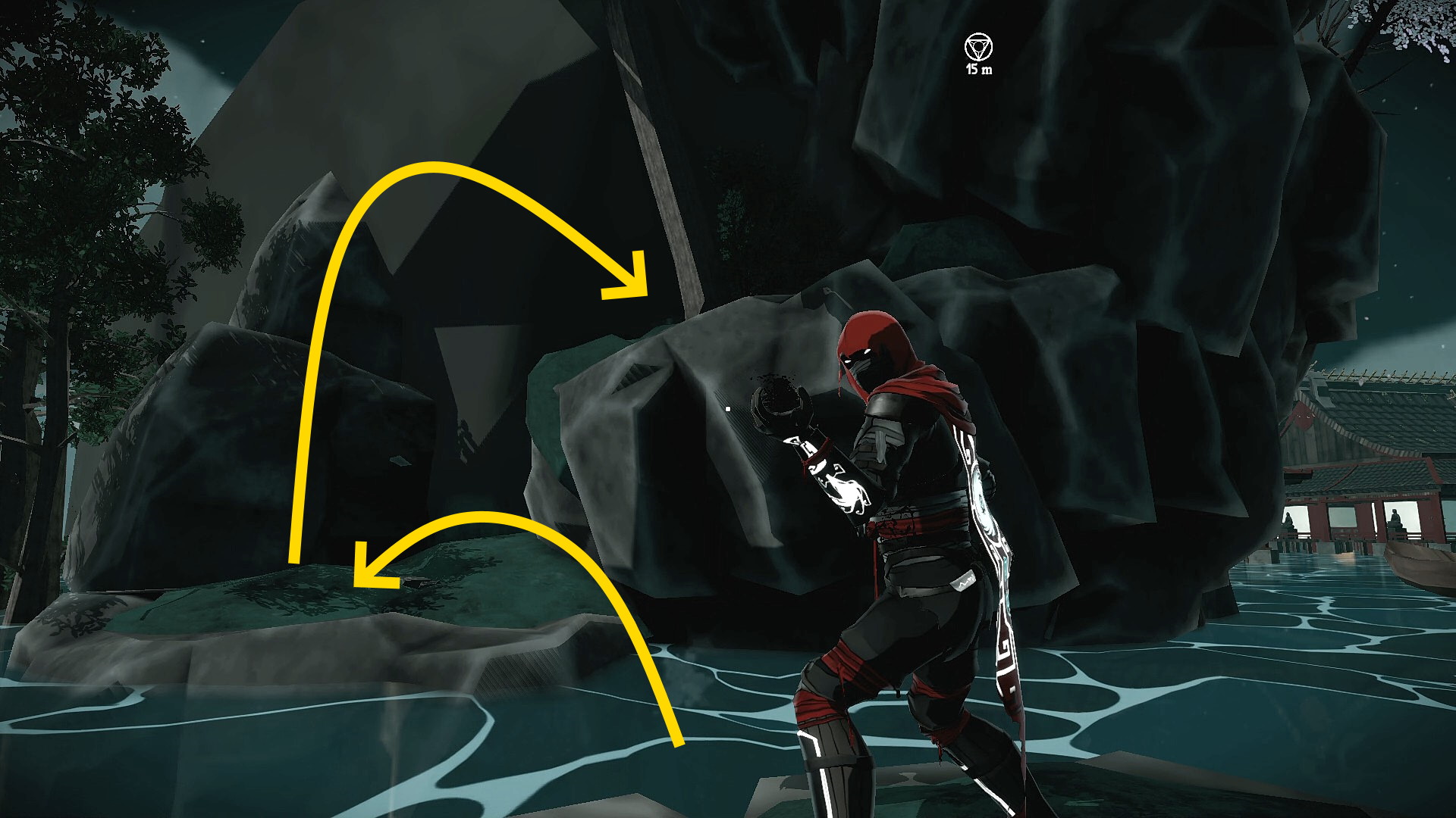 - その先の浮島に移動し、タリスマンがある鳥居ではなく岩山にシャドーリープする