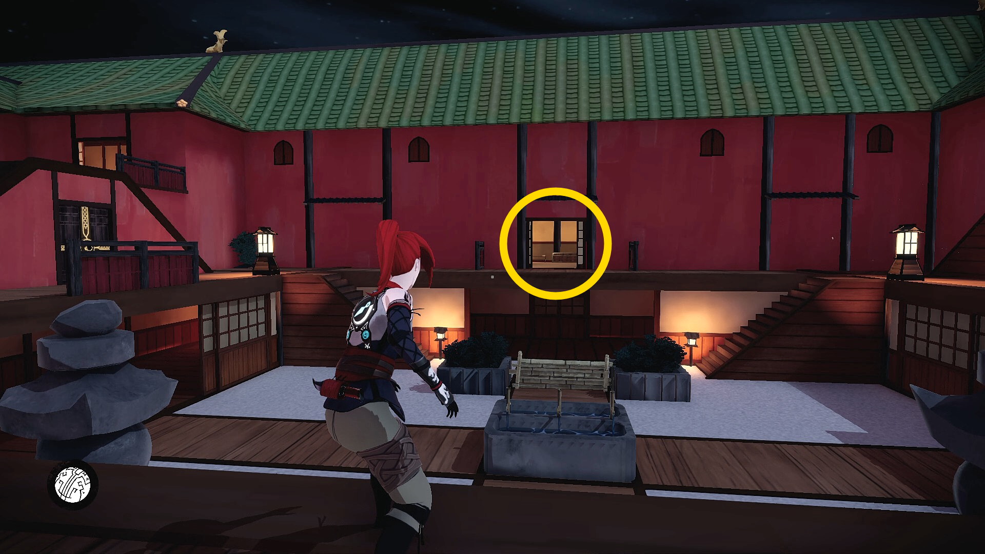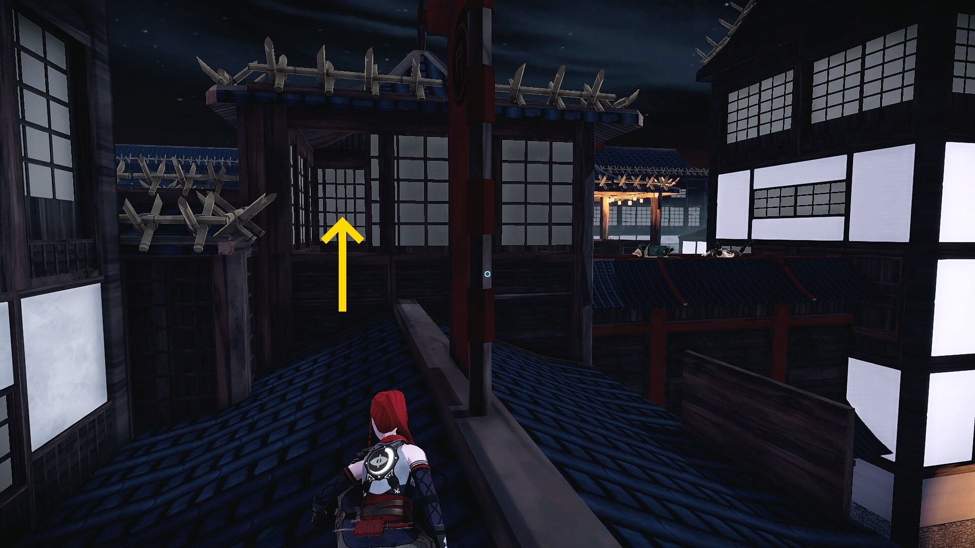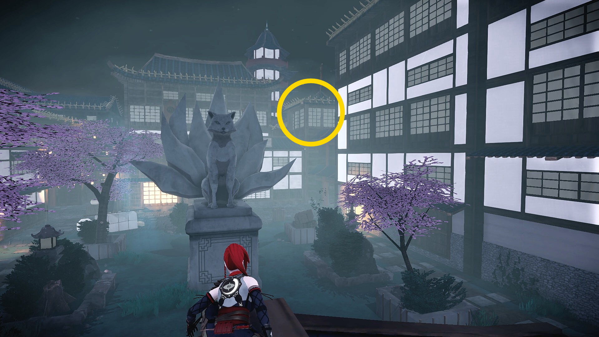 - キュウビの石像の裏にある建物の屋根にのぼり、小部屋に入れる