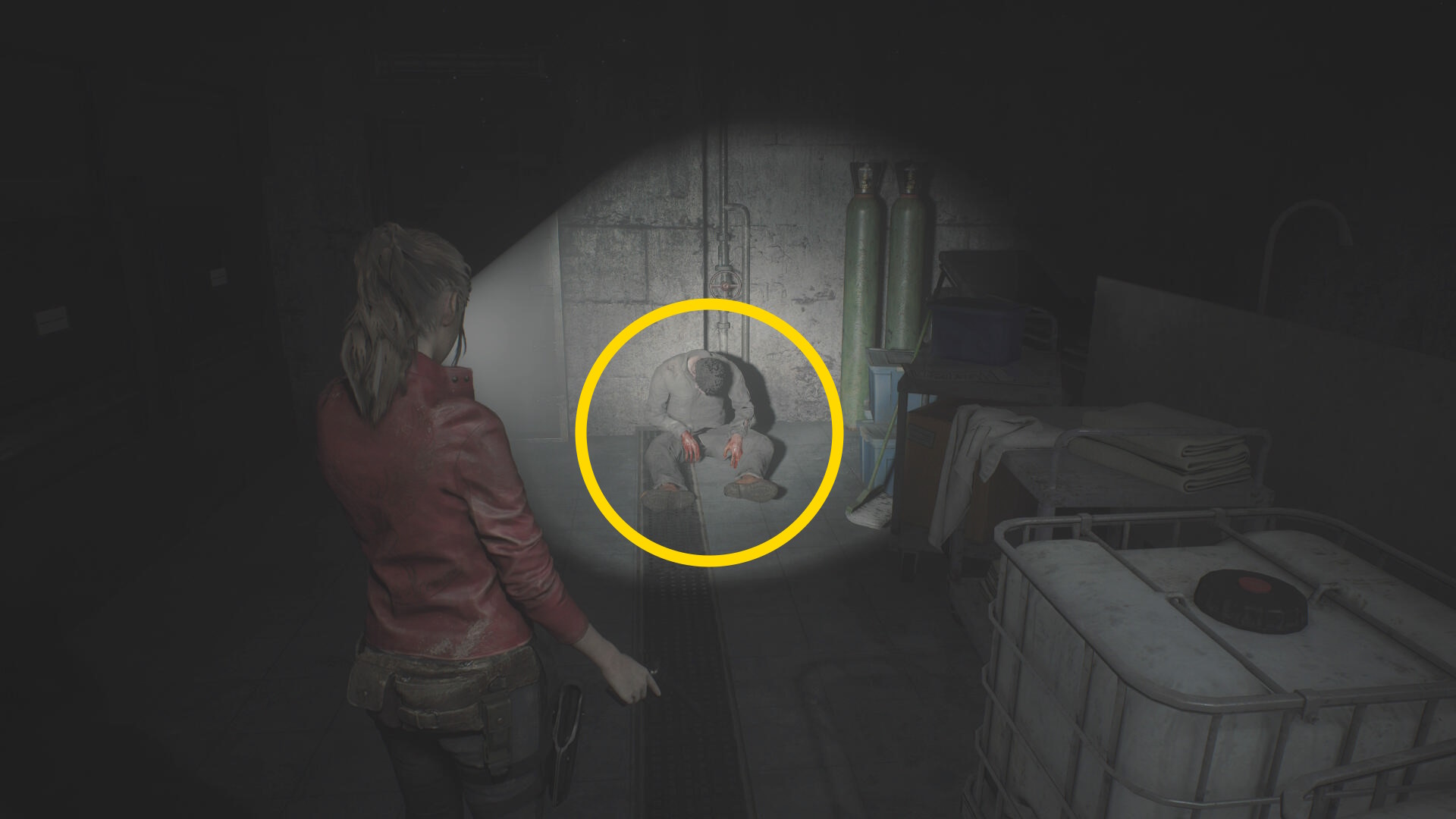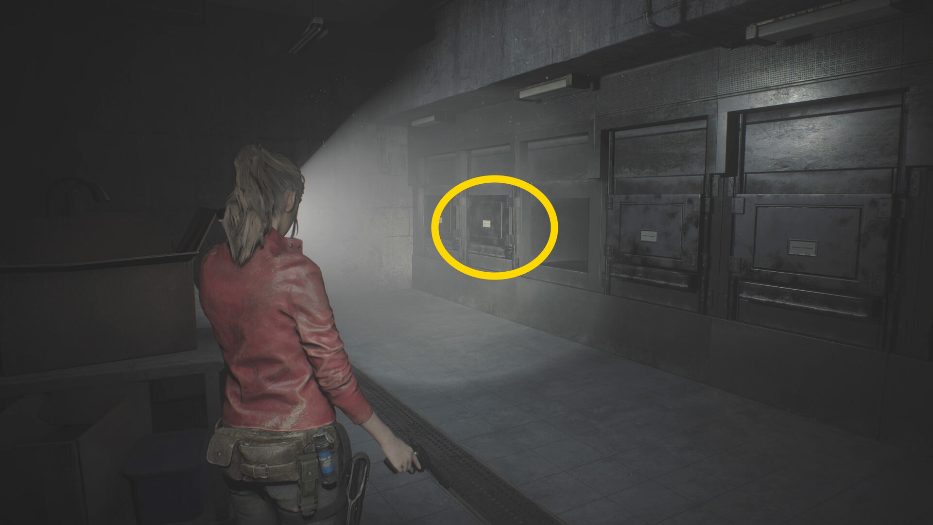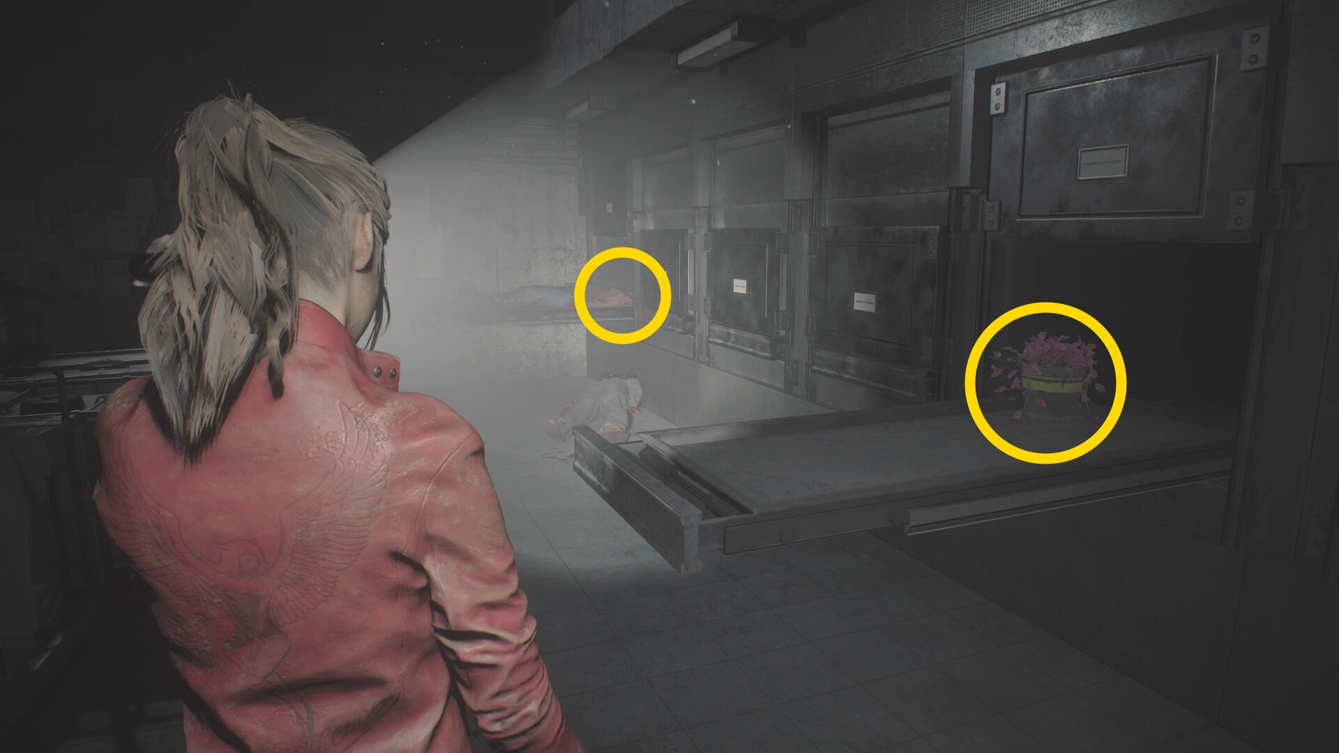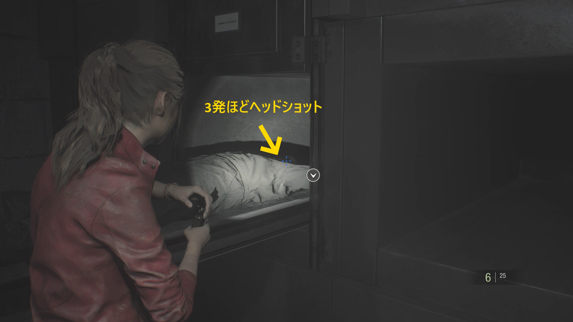 - 反対側の遺体保冷庫に向かい、左から2番目を開けるが、すべて引き出してしまうとゾンビが動き出す(床に落ちてから襲ってくる)