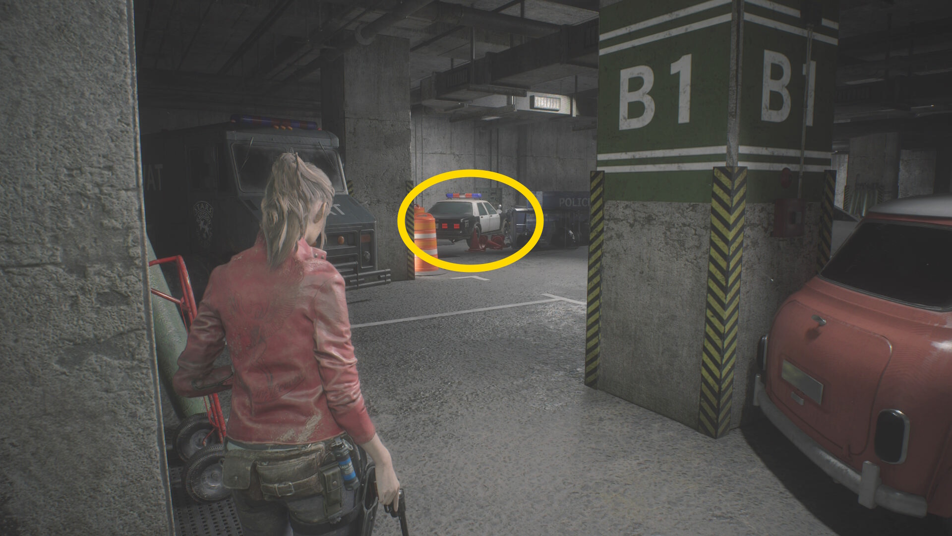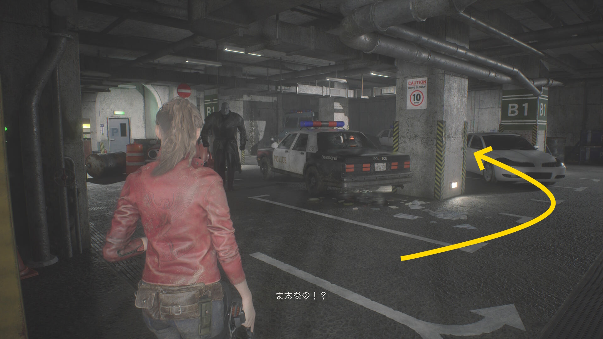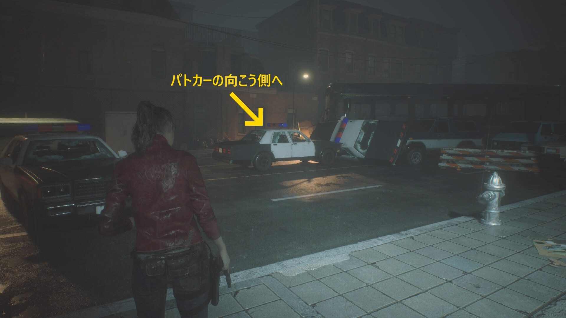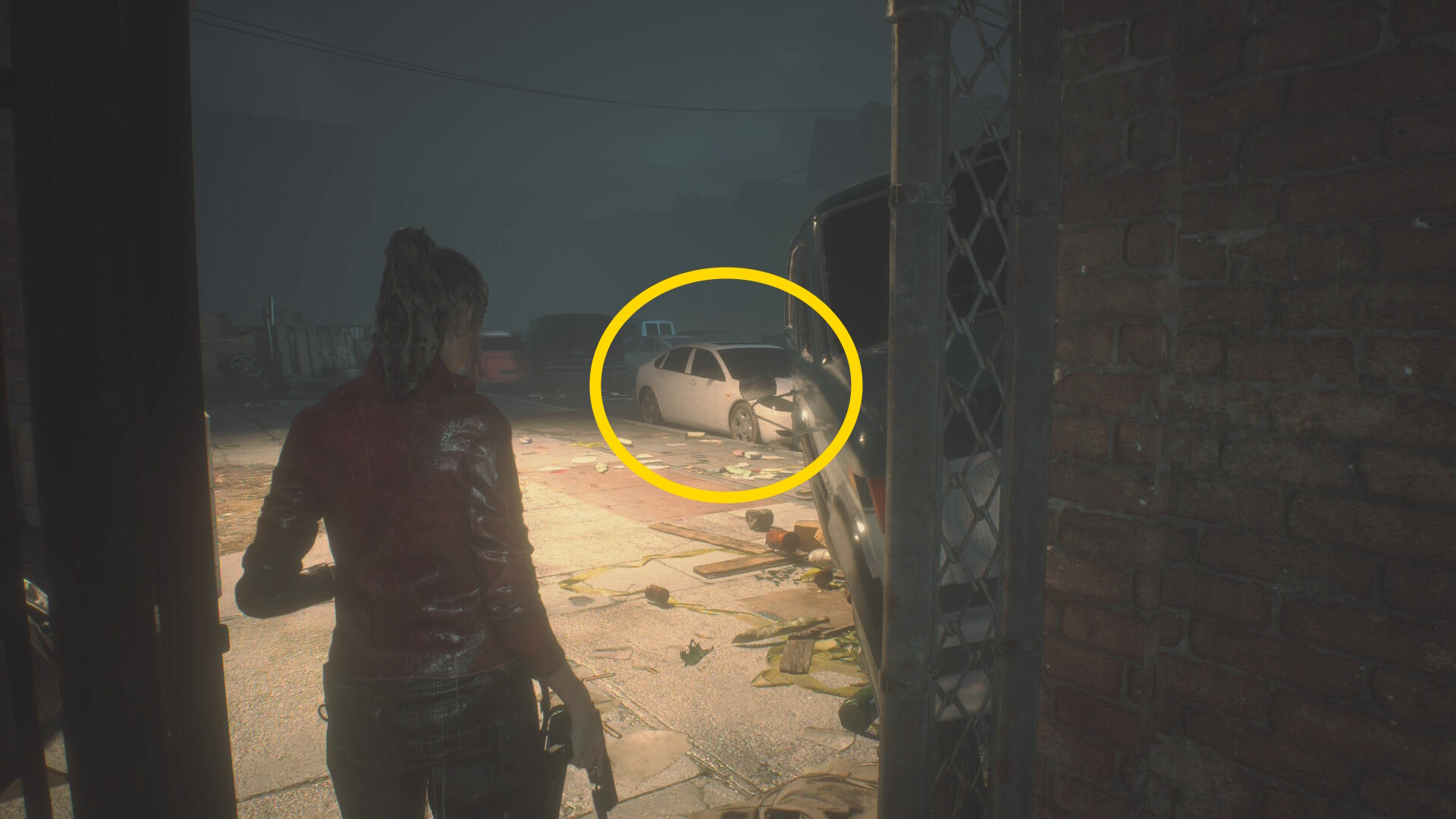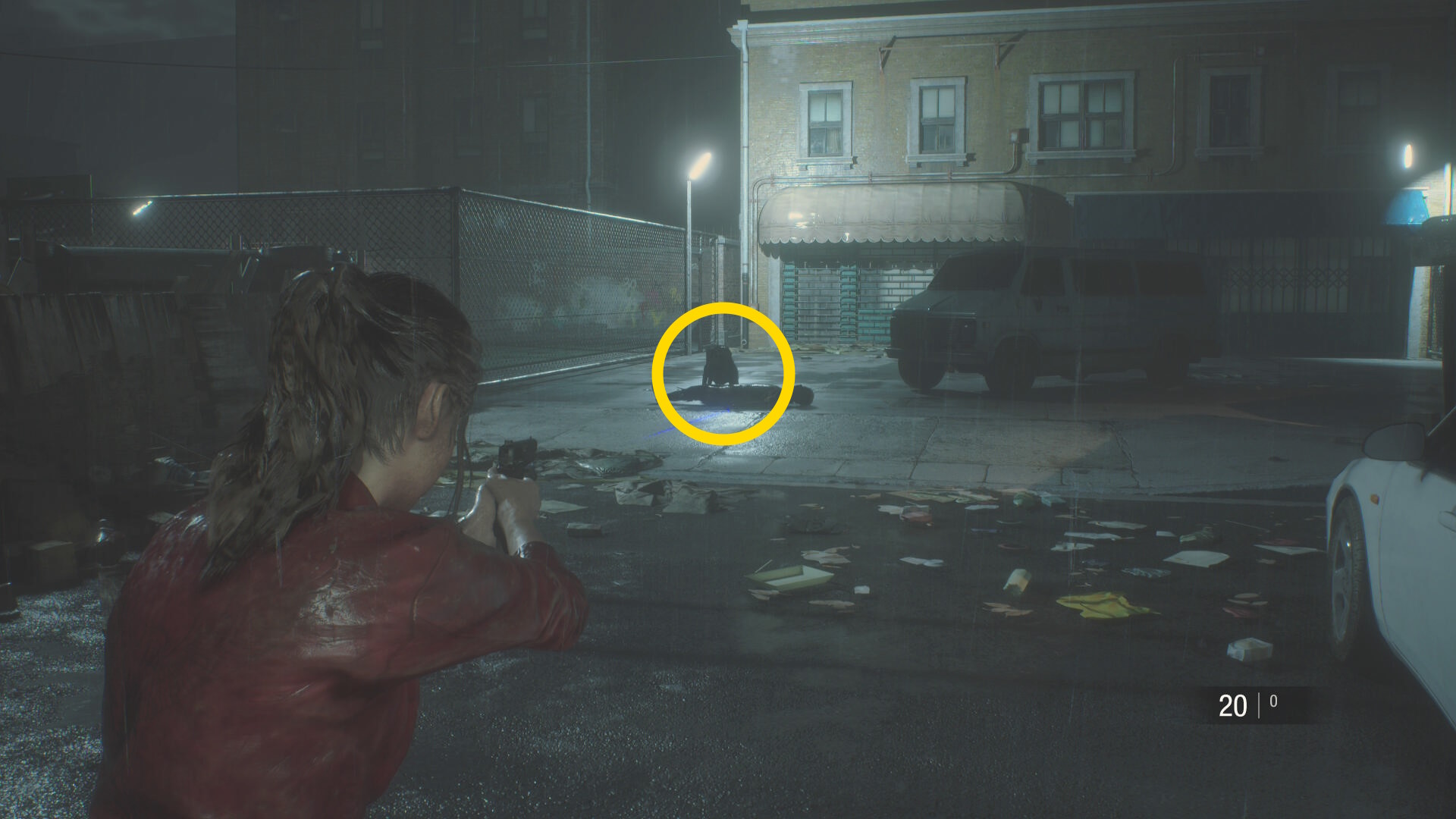 - 白い車のところから右に U ターンするように進むと食事中のゾンビ犬