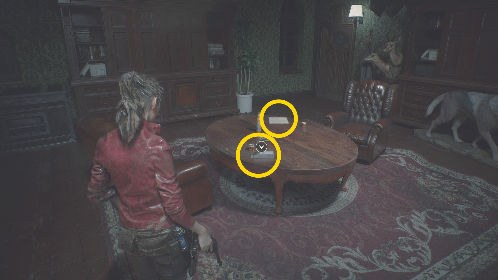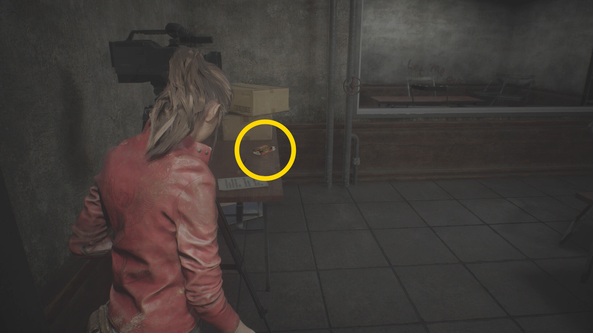 - 取調室に入り、左のテーブル上に 大型拳銃の弾