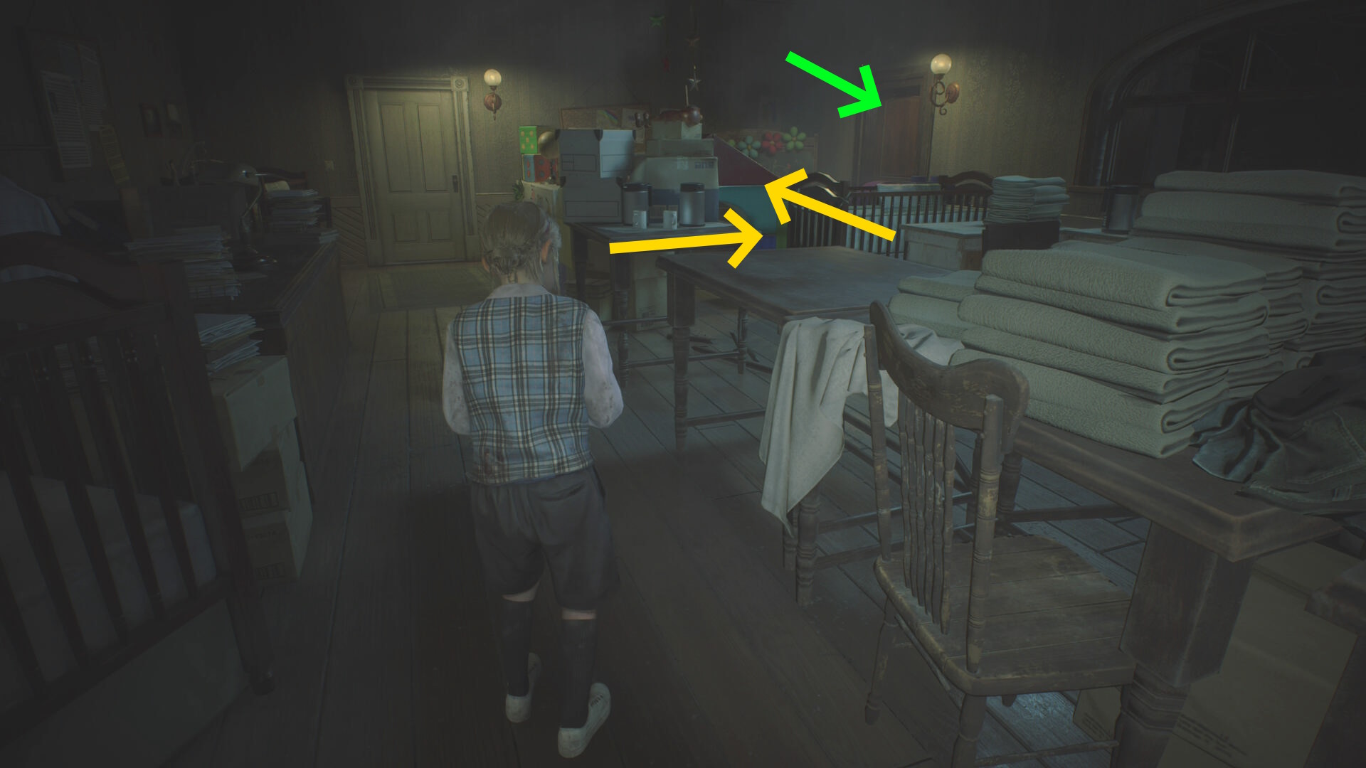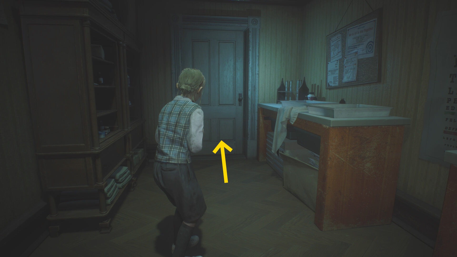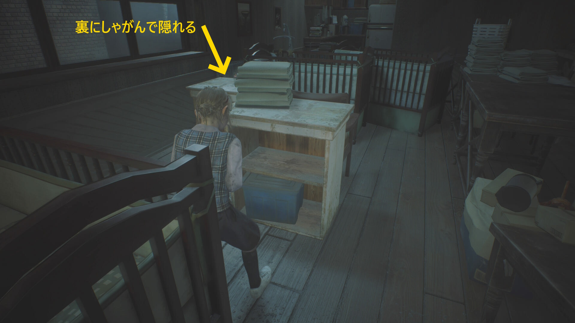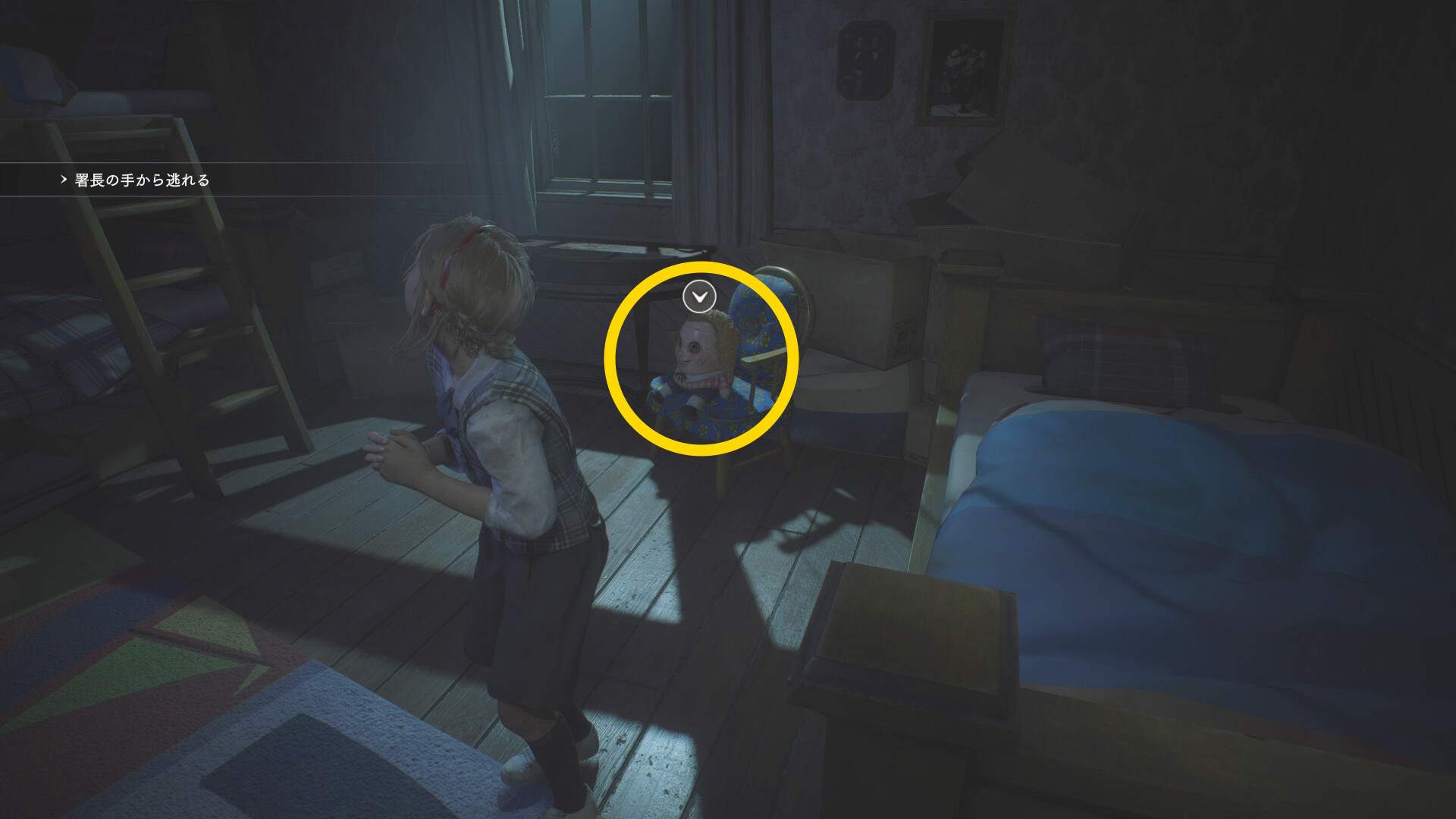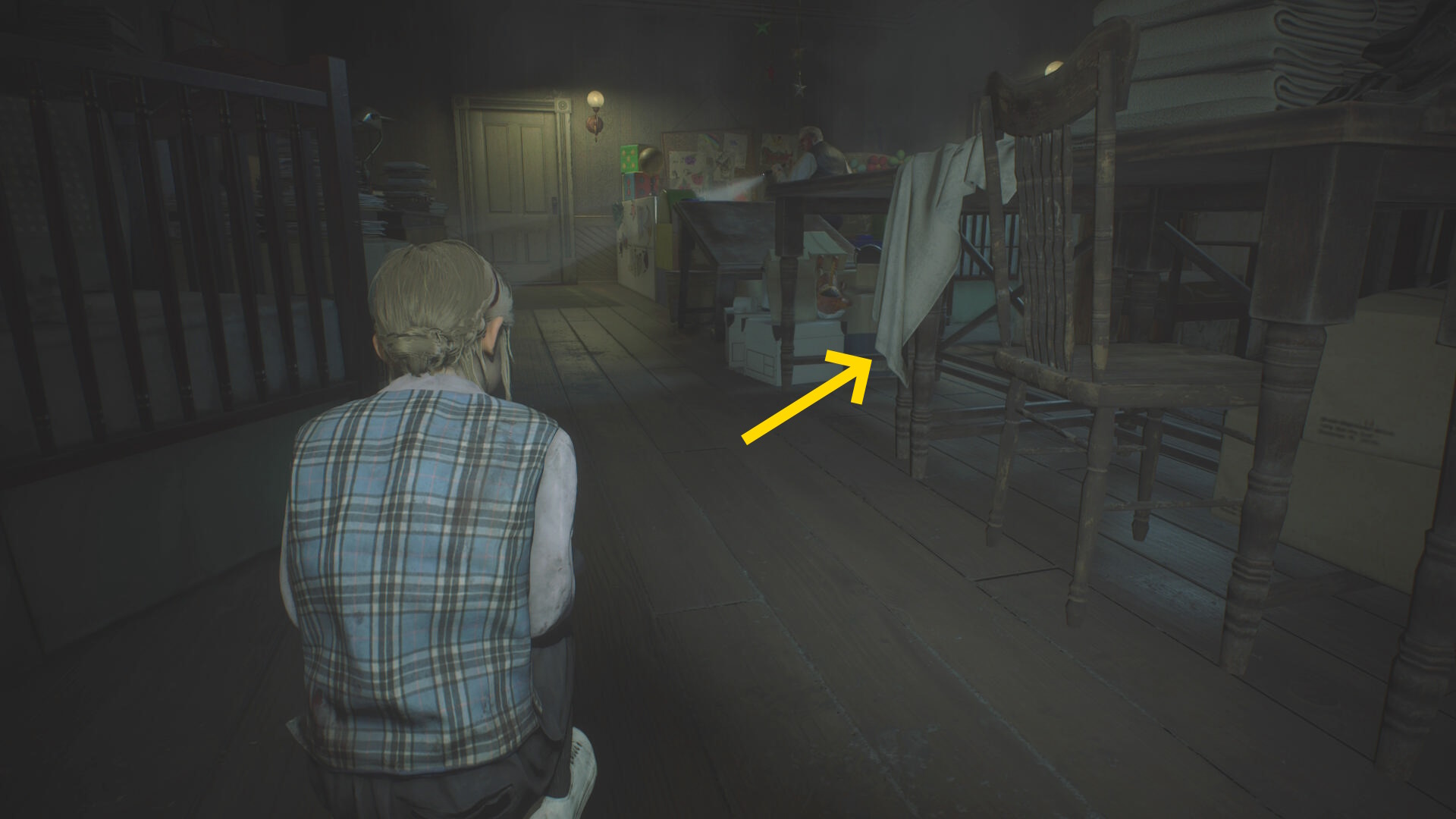 - カットシーン後、机の下から出て洗面所のドアを鍵にそっと近づいて 孤児院の鍵 を回収