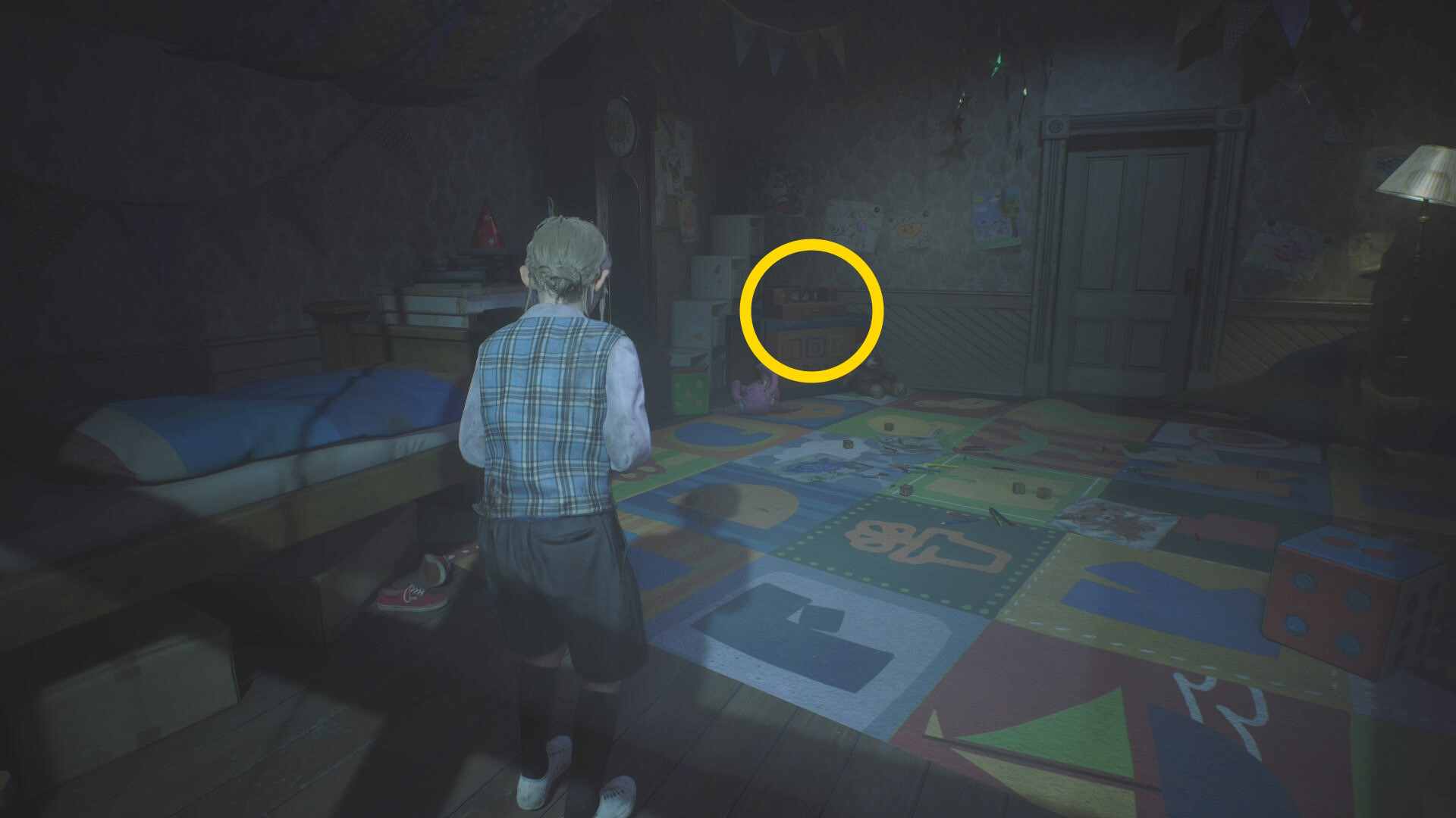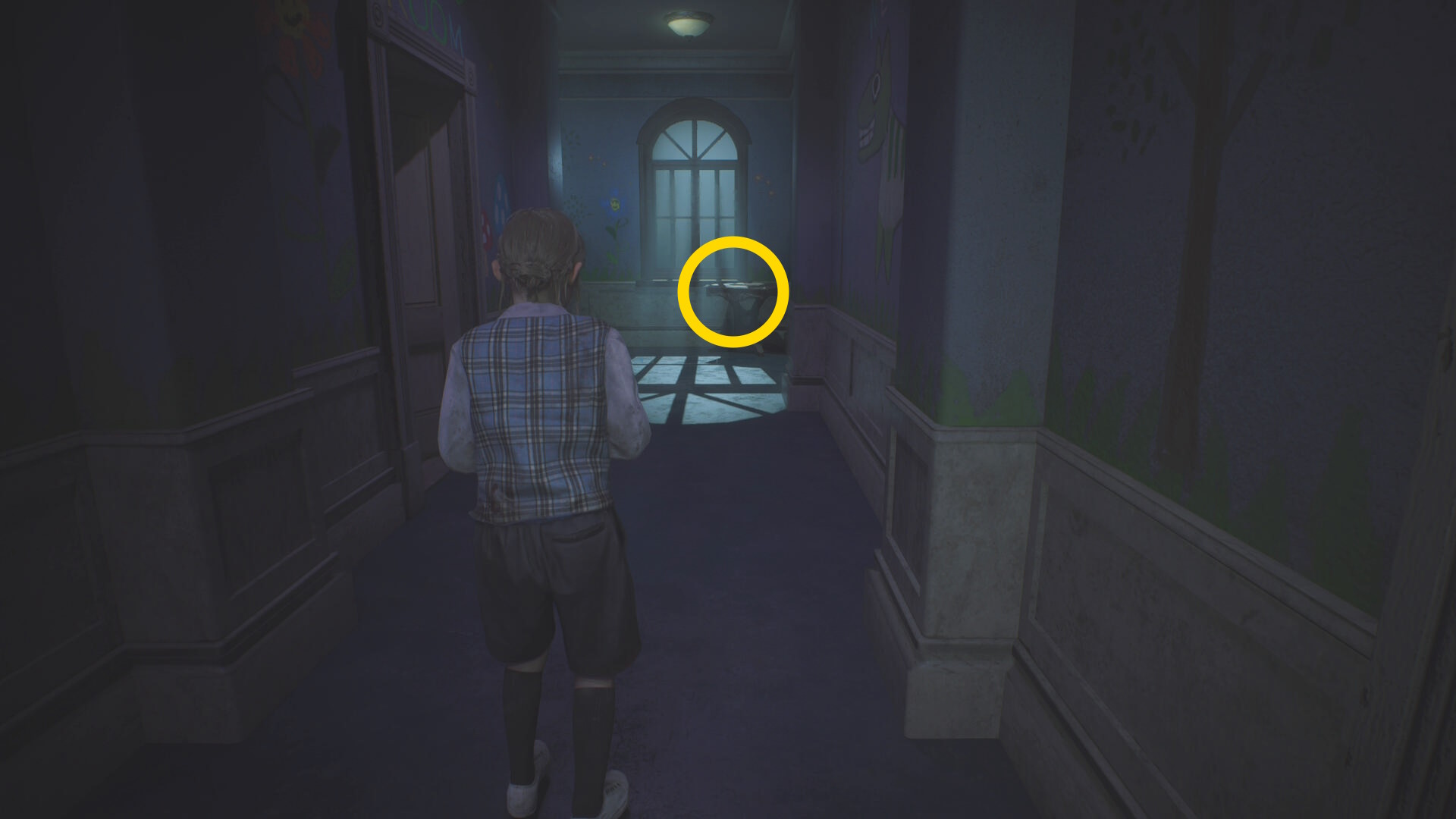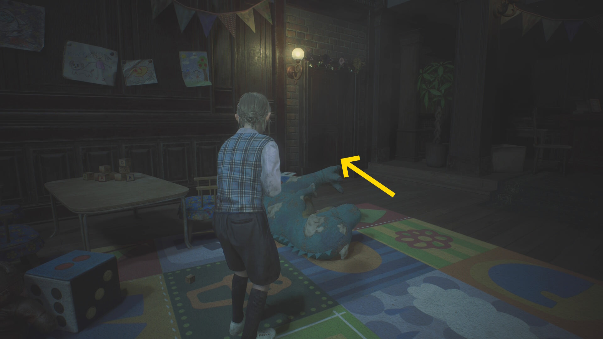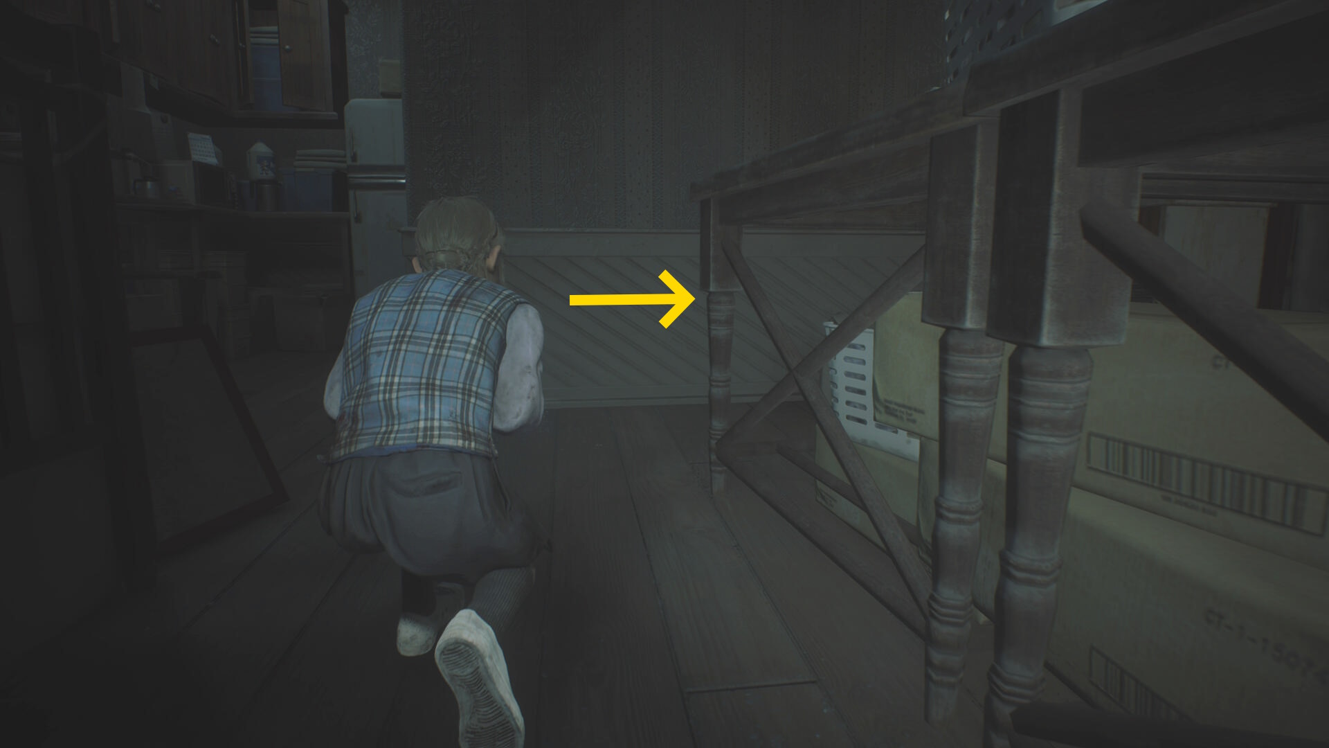 - カットシーン後、机の下から出て洗面所のドアを鍵にそっと近づいて 孤児院の鍵 を回収