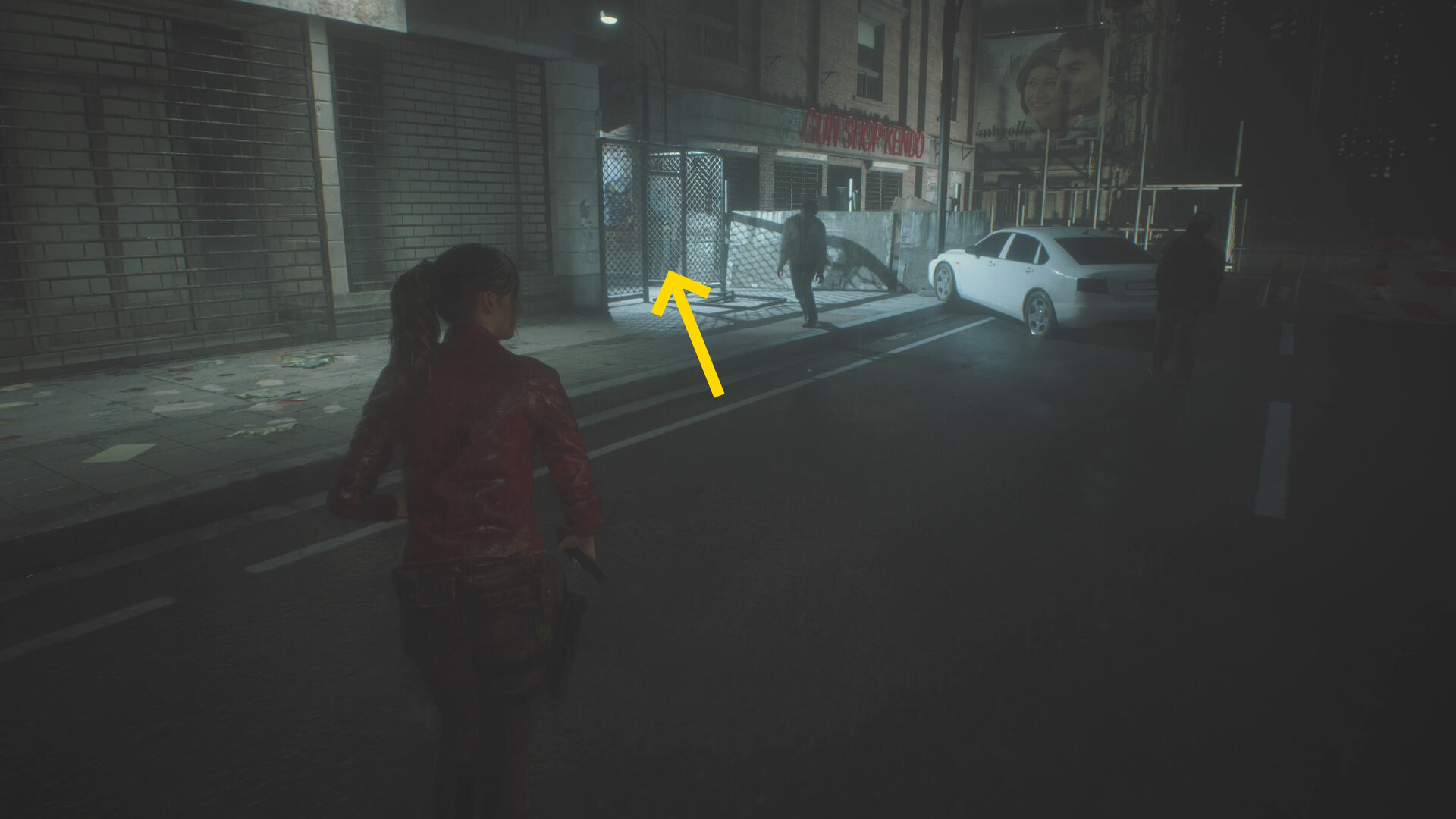 - ケンドのガンショップの手前(左)にフェンス状ドアがあり、そこに2体のゾンビがいるのでそこに近づく