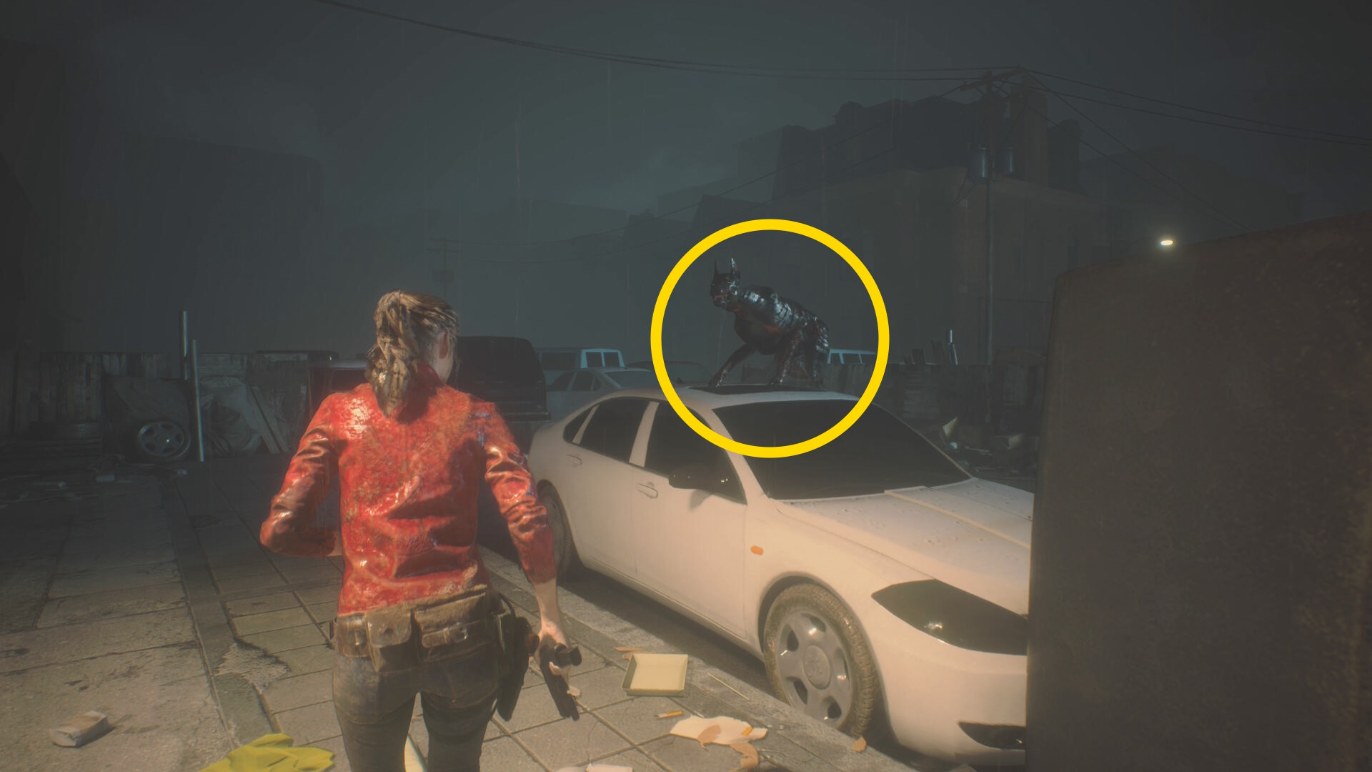 - 右前方に白い車があり、そこに近づくと車の屋根にゾンビ犬が出現するのでキル