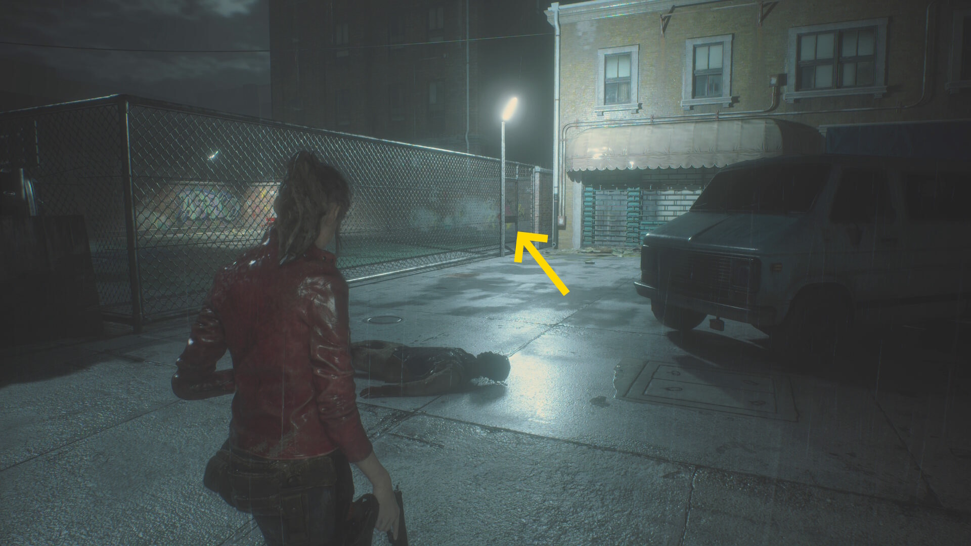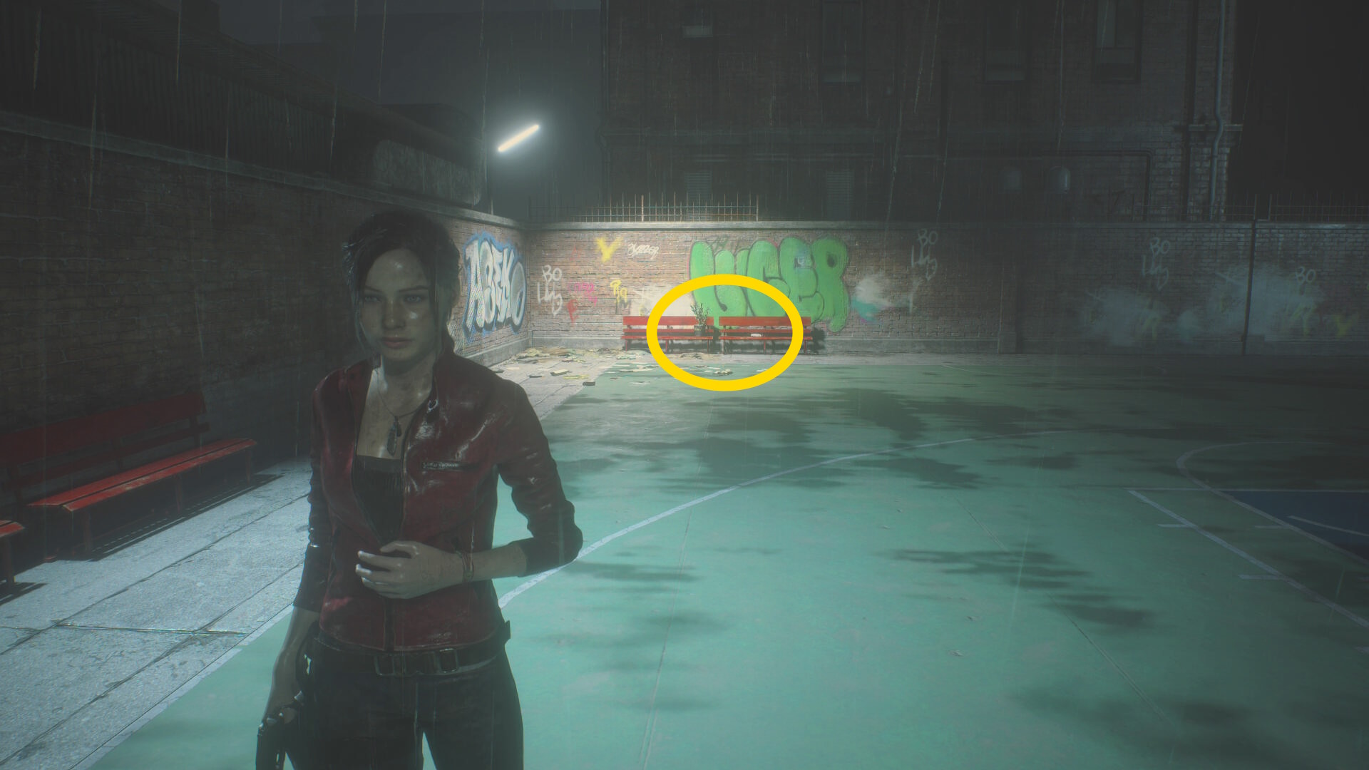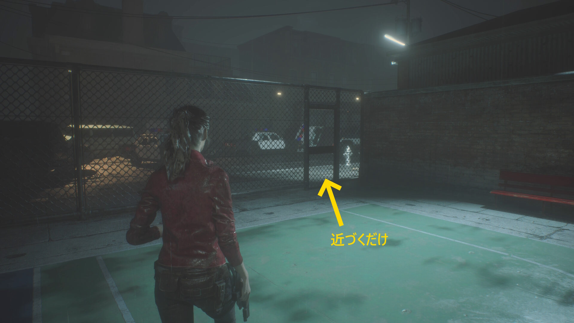 - 食事中のゾンビ犬をキル後、奥のフェンス状ドアを開けてバスケットコートに入る