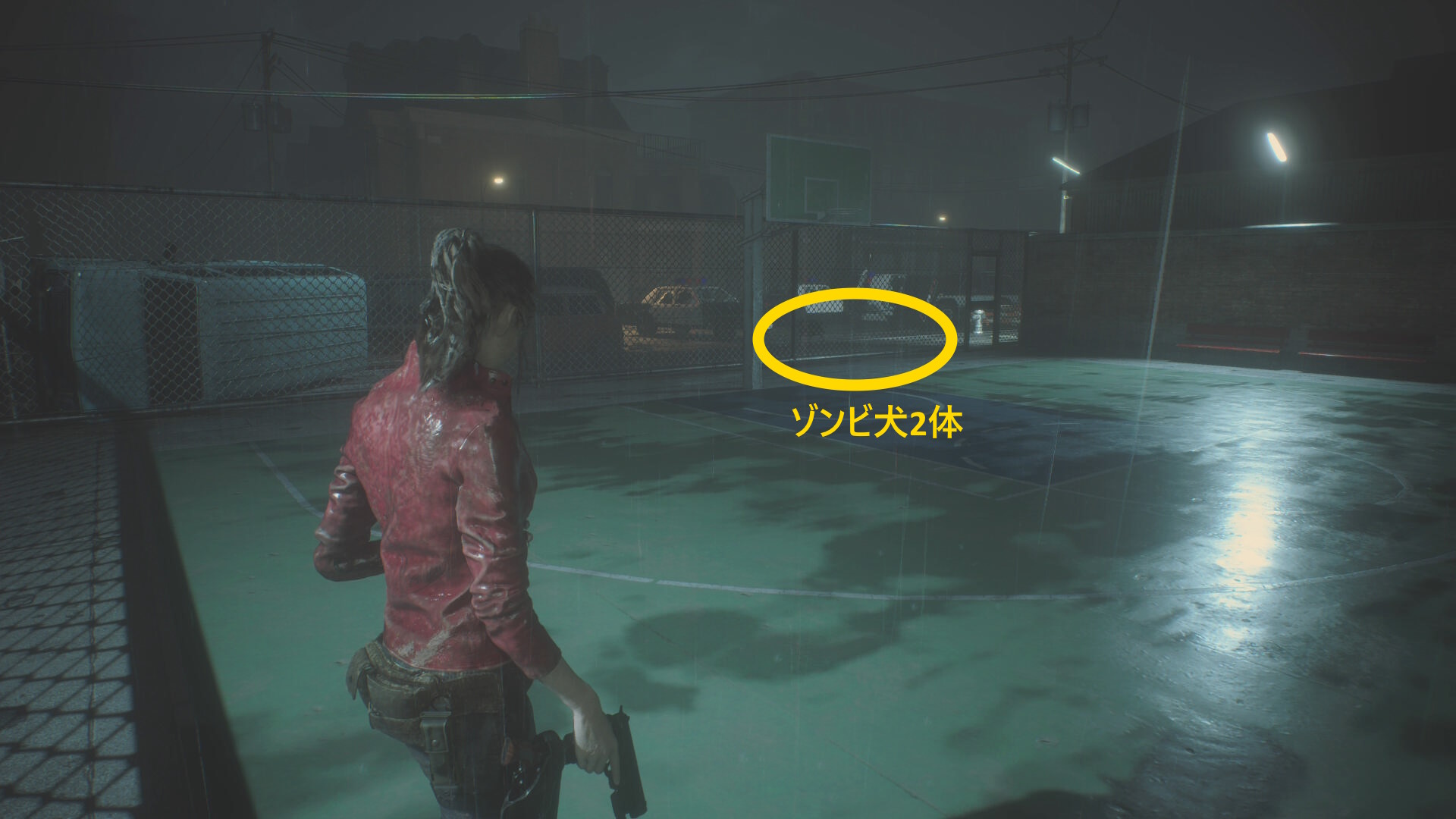- バスケットコートに入ったら、左前方のバスケットゴールのほうへ進むとフェンスの向こうにゾンビ犬が2体出現