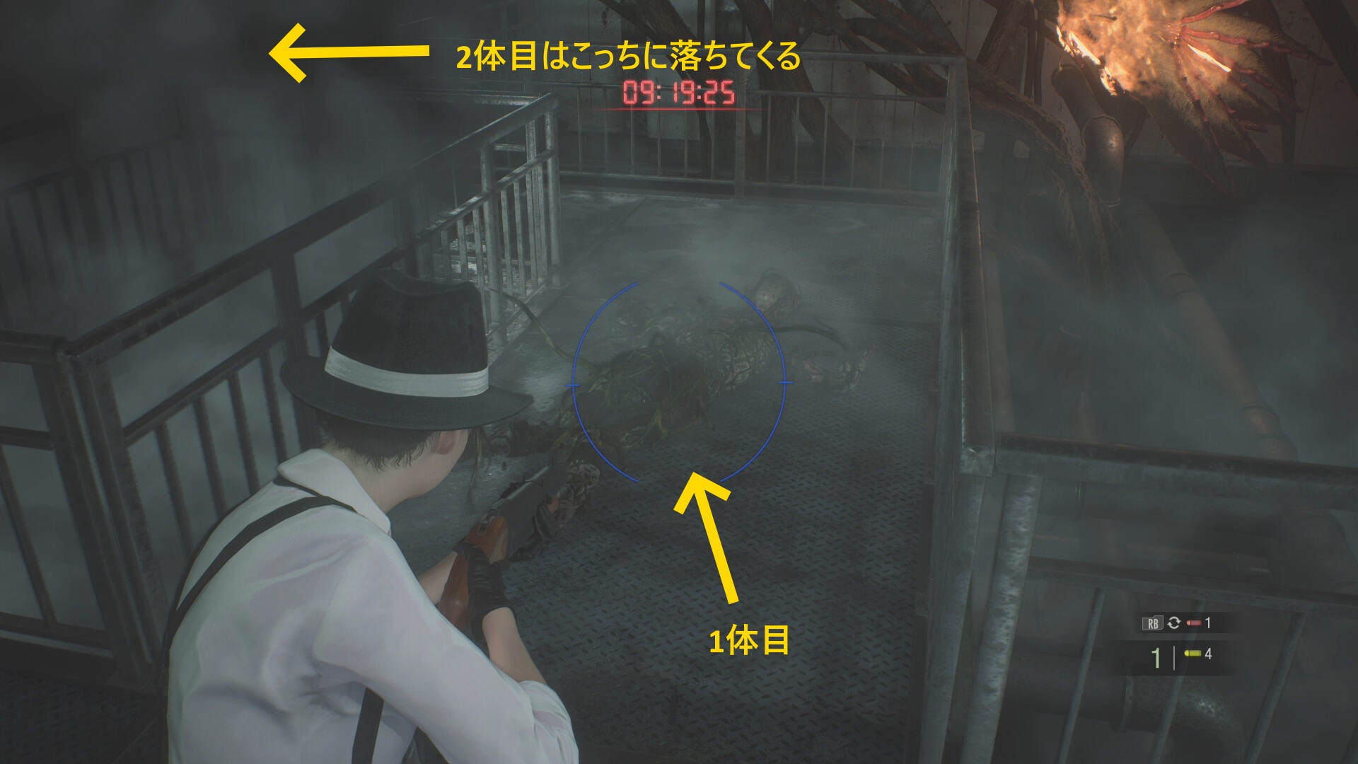 - 2体目をダウンさせたあと、1体目が起き上がってくるのでもう1発当てておく(このあと、すぐにドアが開く)