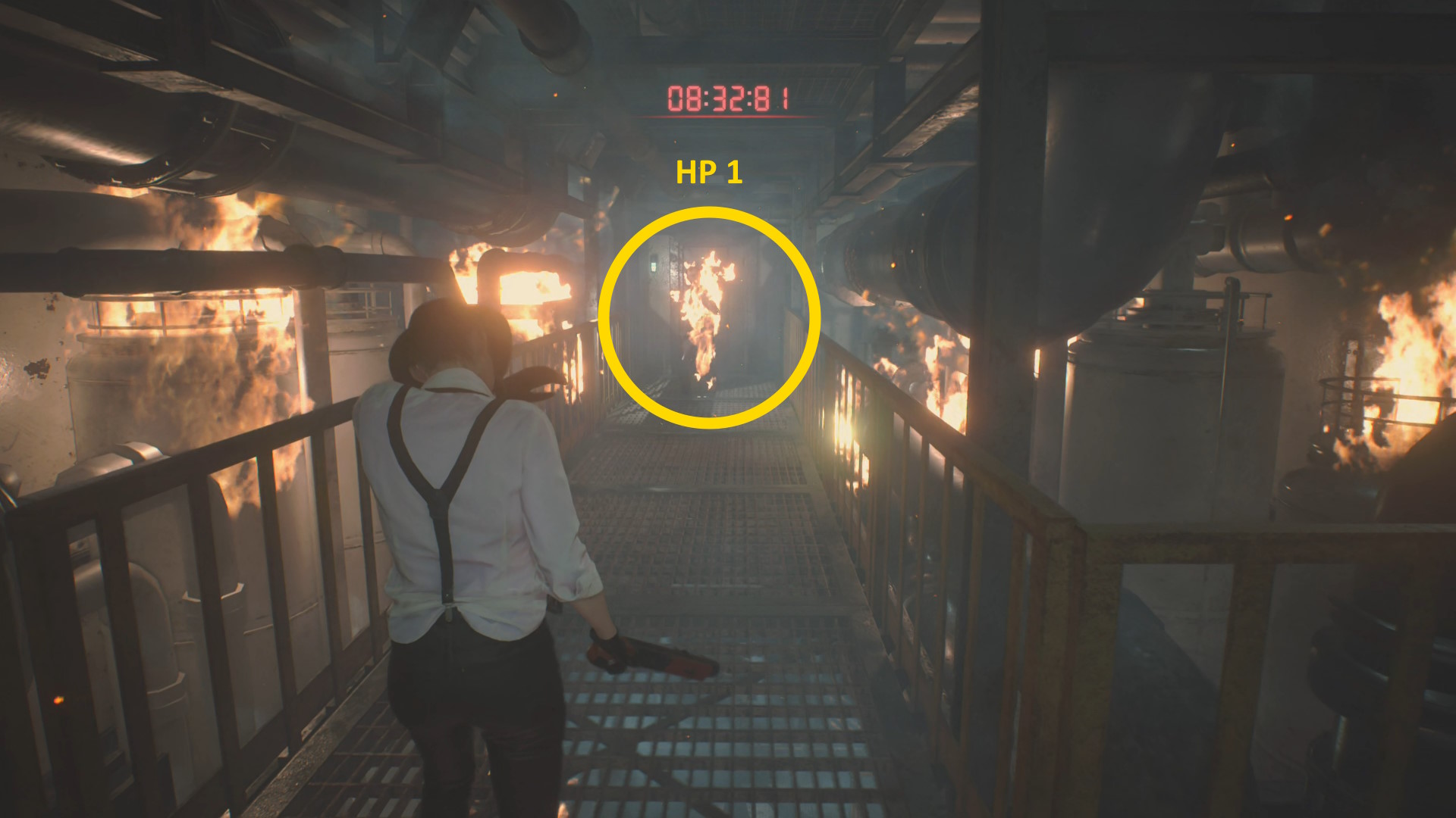 - ドアを通過後、道なりに進むと燃えるゾンビが向かってくる