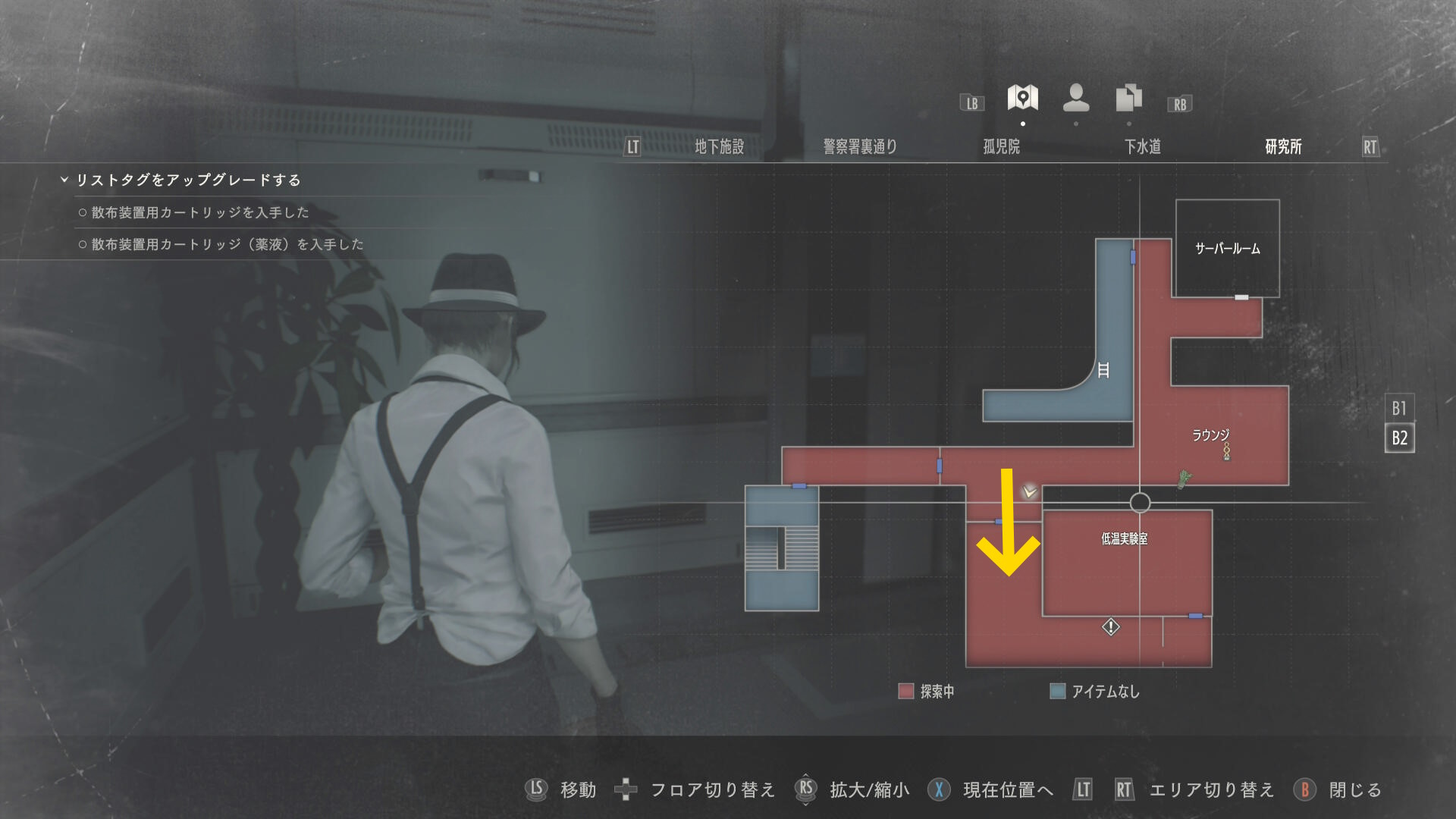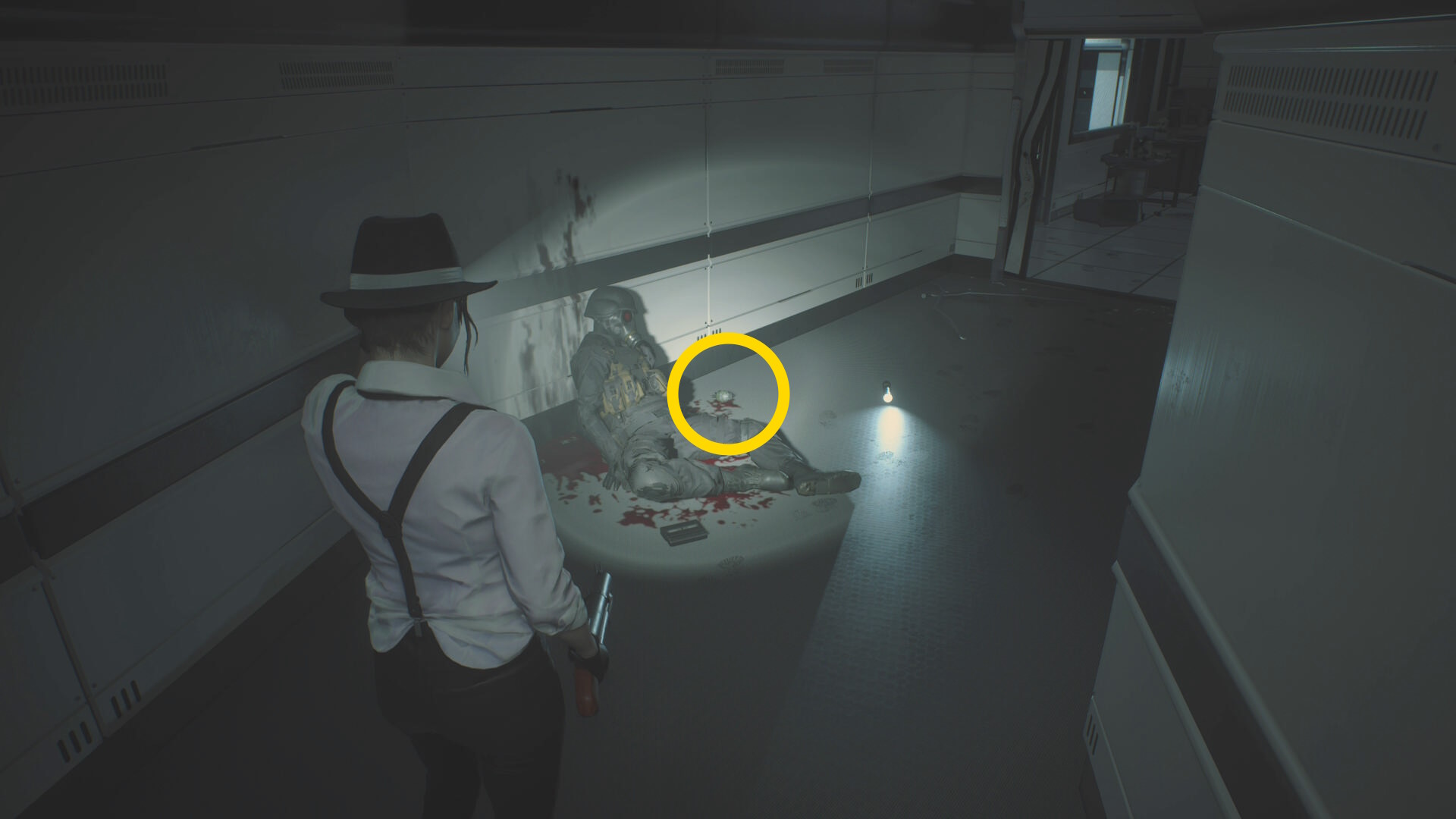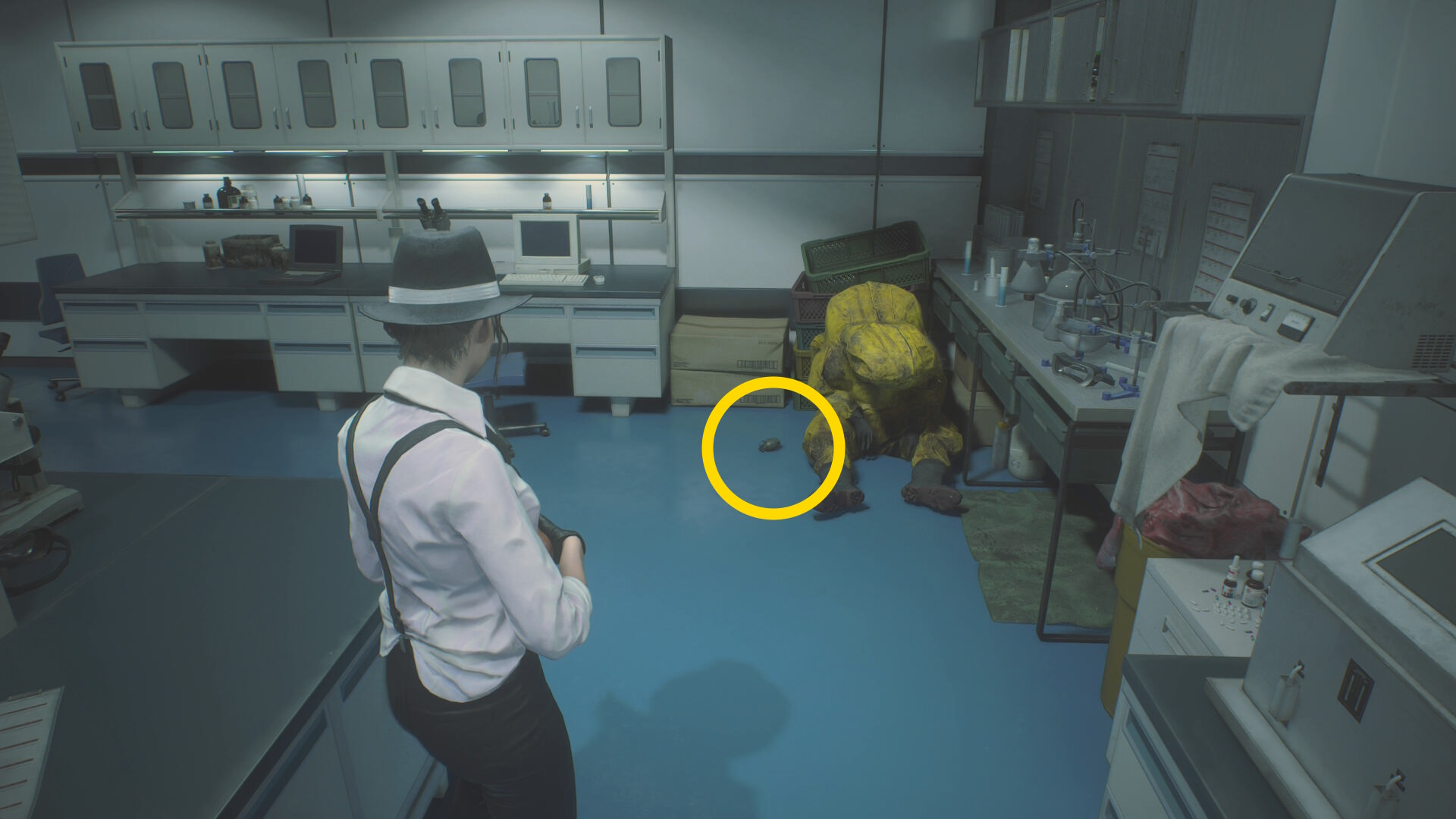 - 入ってすぐ正面奥につなぎゾンビがいるが無視して、左の白衣の死体から 破片手榴弾 を回収