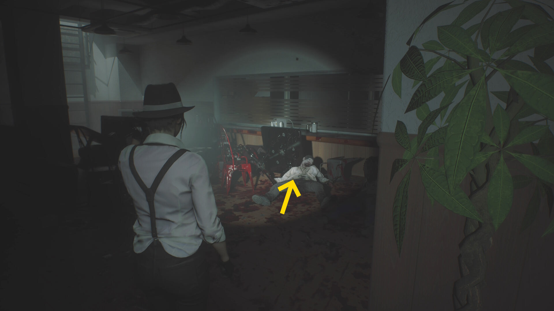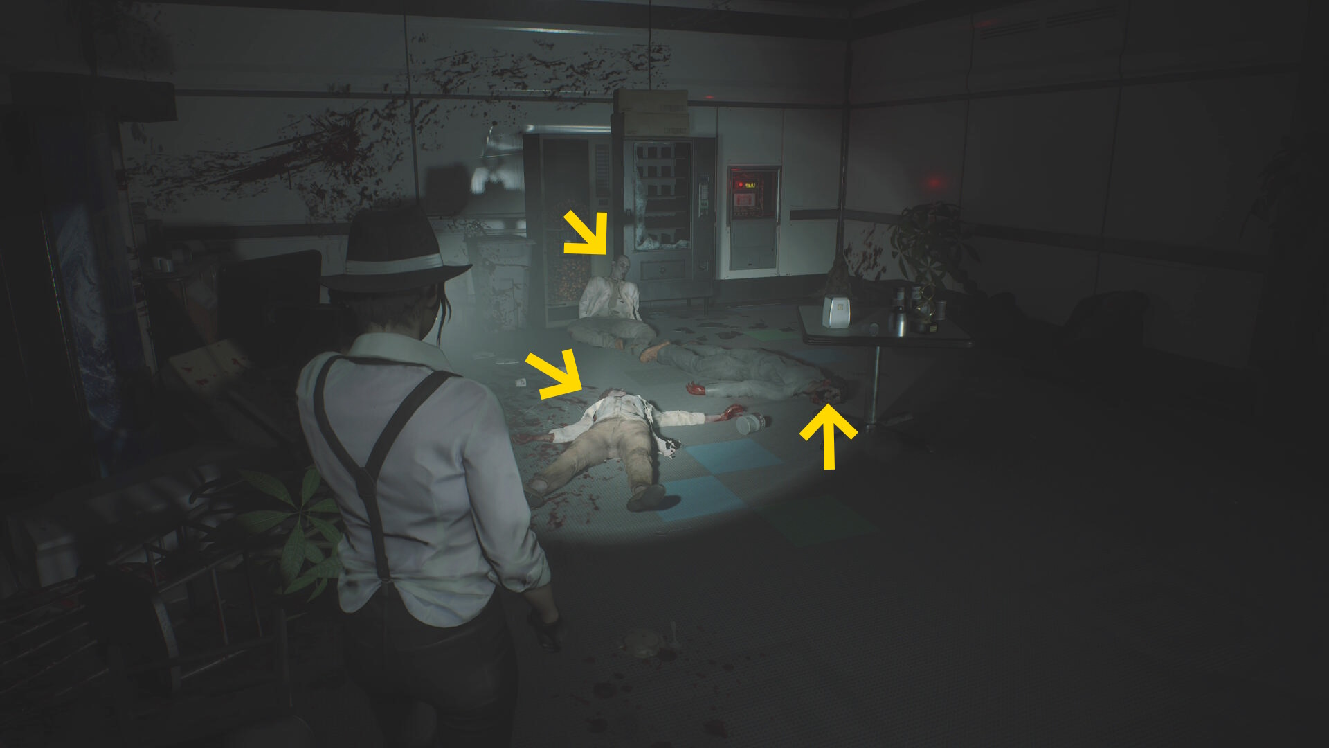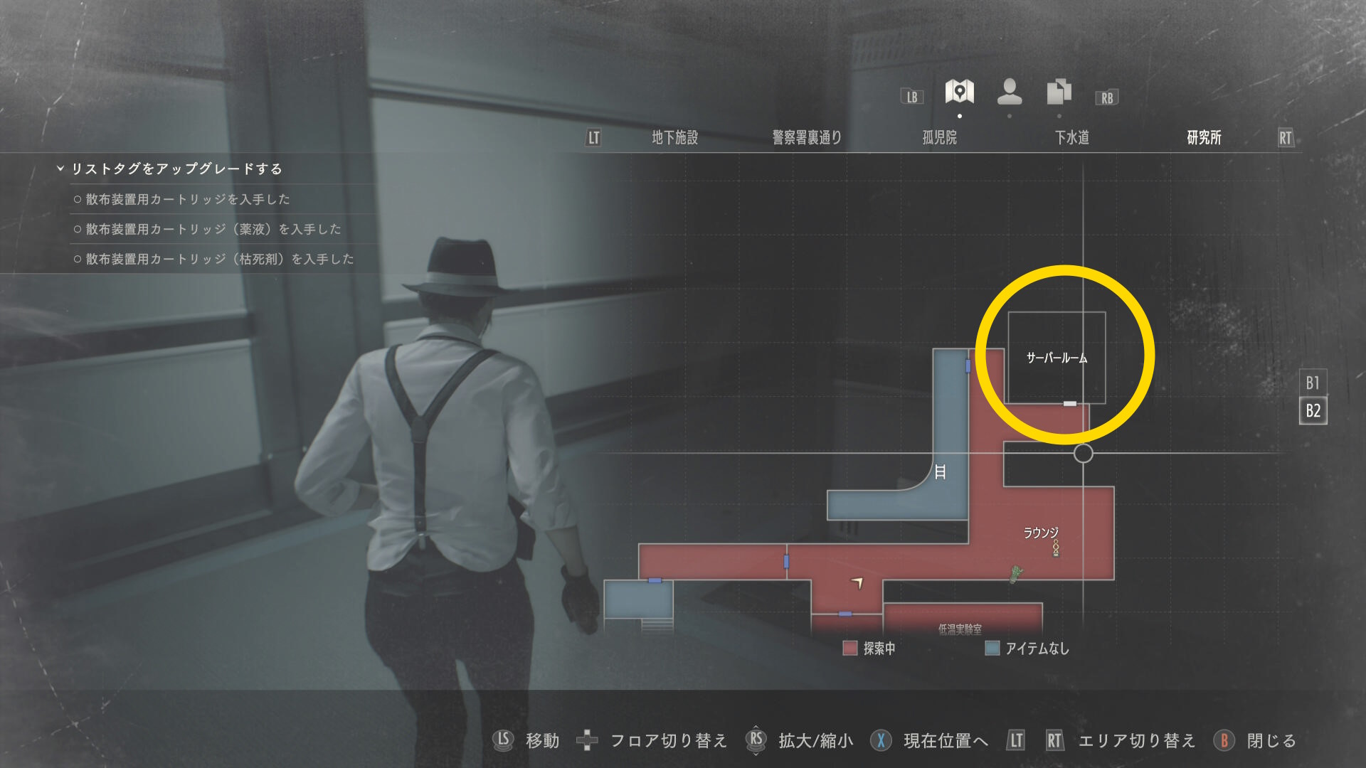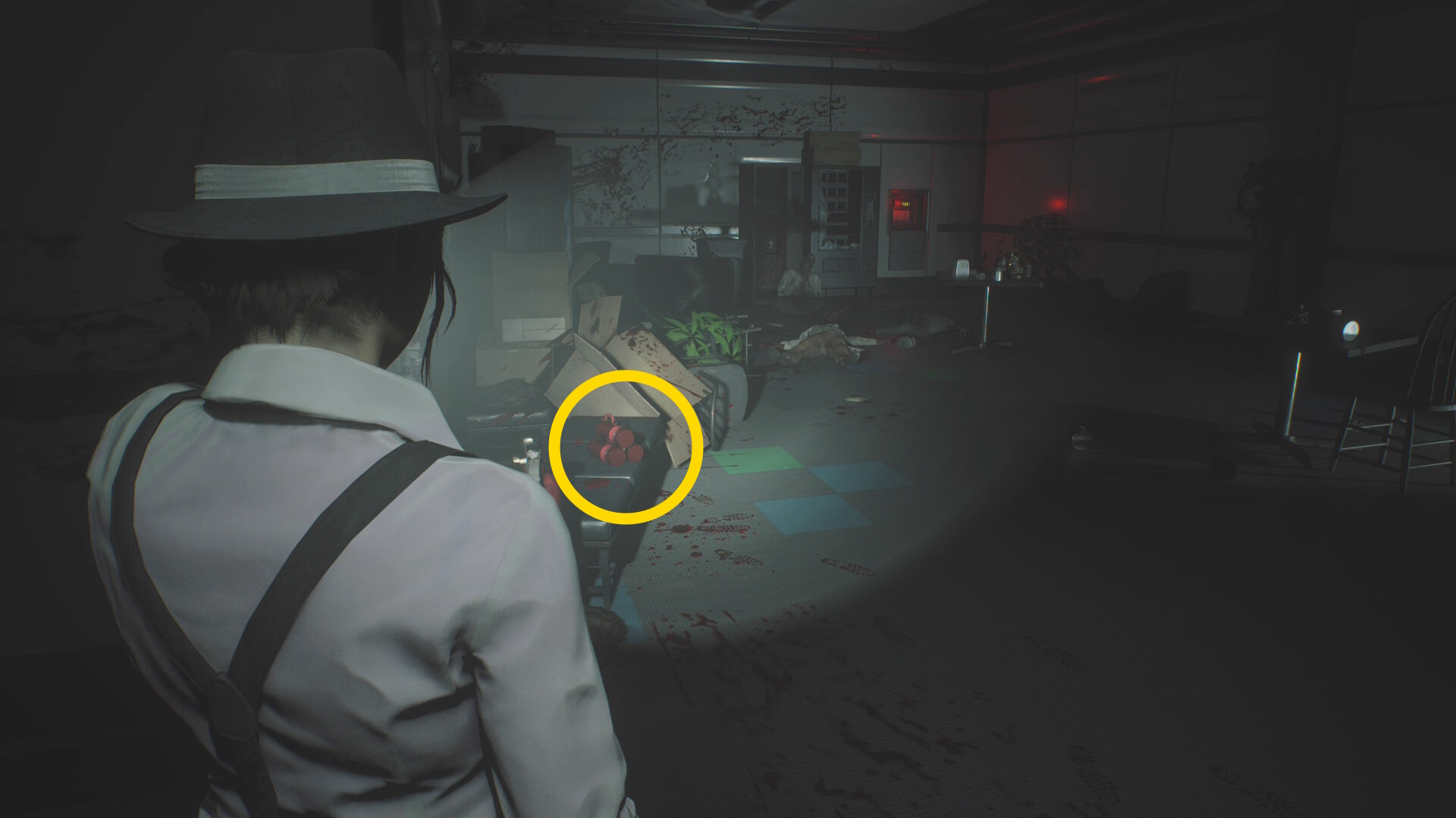 - 入ってすぐ正面奥につなぎゾンビがいるが無視して、左の白衣の死体から 破片手榴弾 を回収