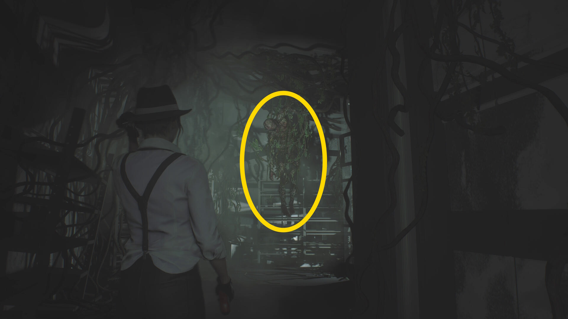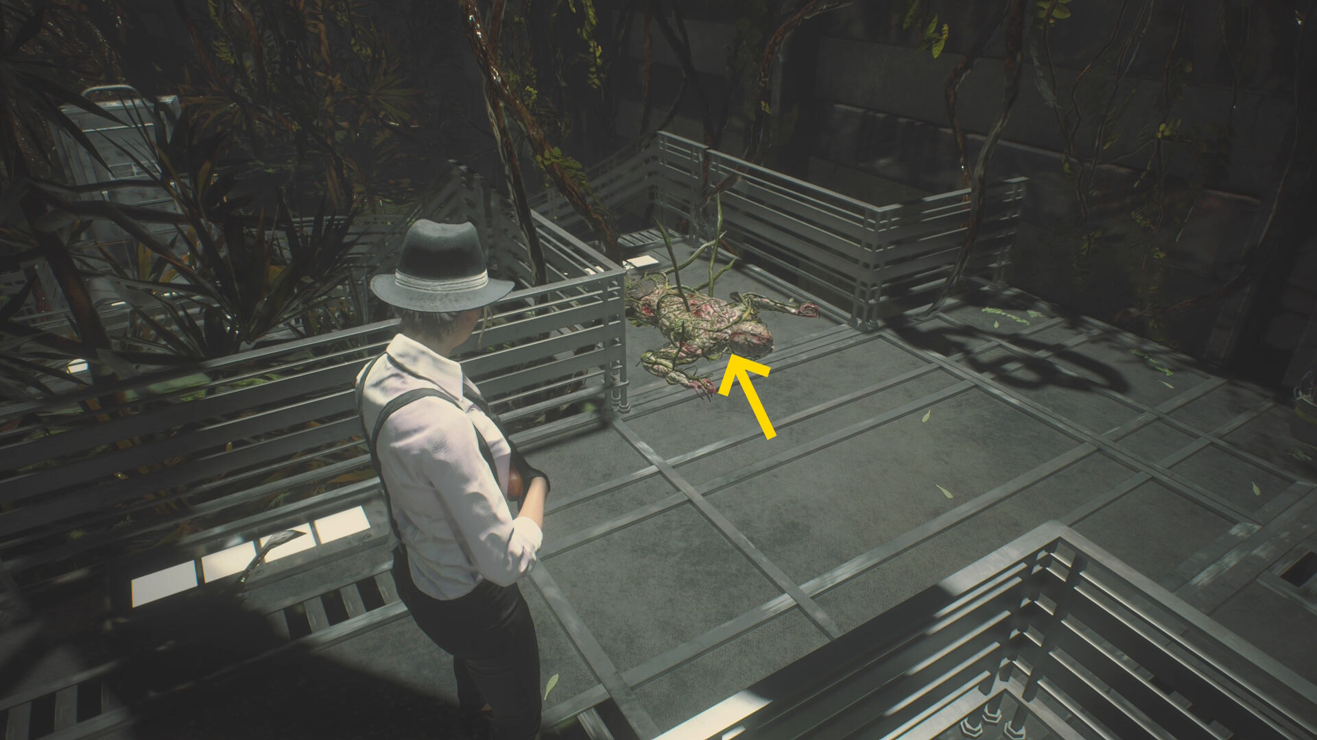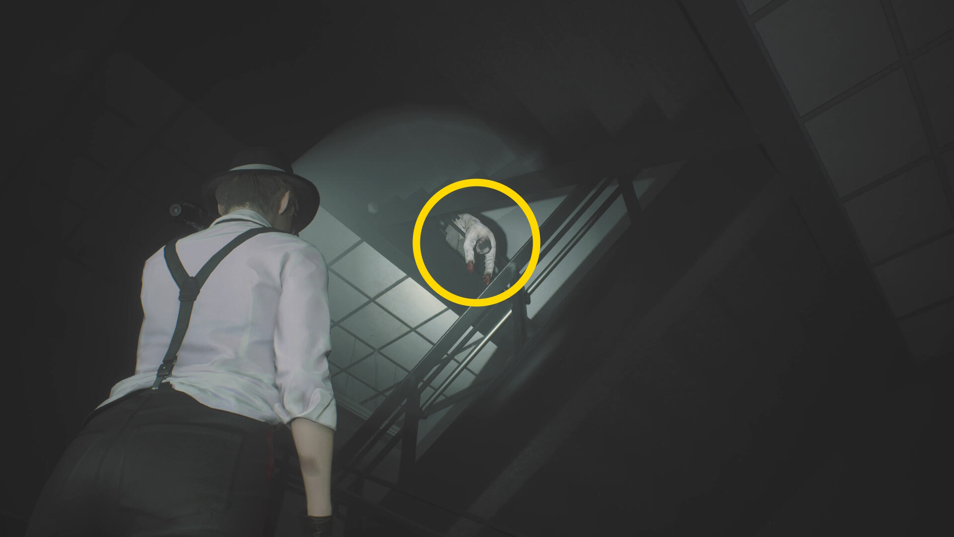 - 2つ目の階段を登る途中、右上を見上げるとゾンビが見える