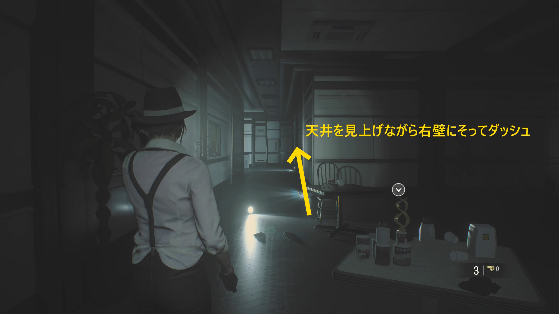 - 突き当りにドアがあり、天井を見上げたまま右壁に沿ってダッシュで移動