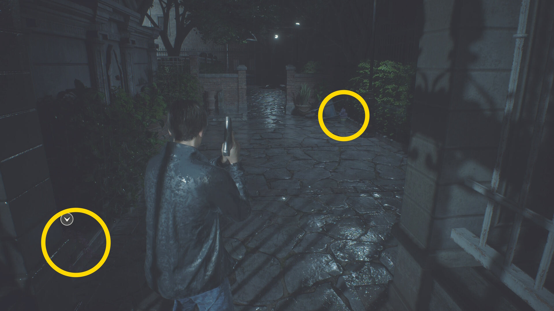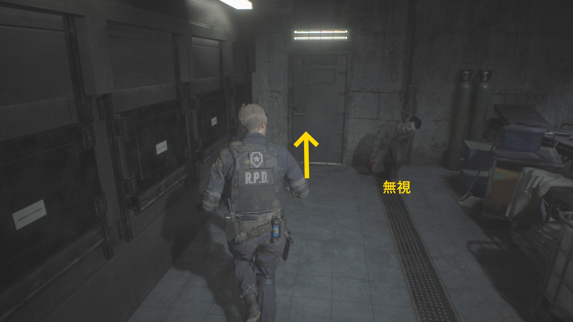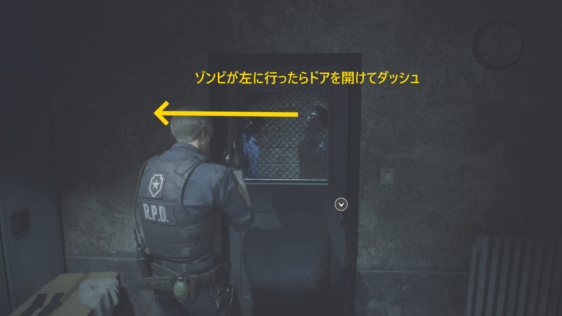 - 調合したハーブ(赤+青)を使い、防御力を上げて突っ込むのも良いが、歩きで移動しながらゾンビを誘導し、その隙にダッシュで抜けることを推奨(ダメな場合は突っ込もう)