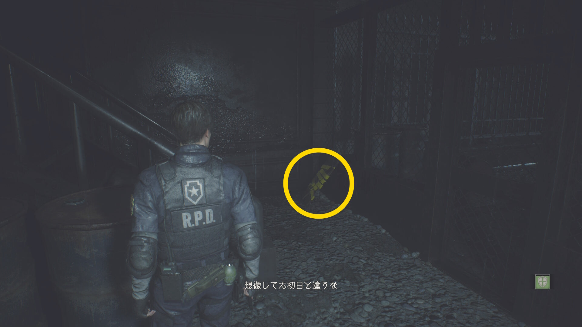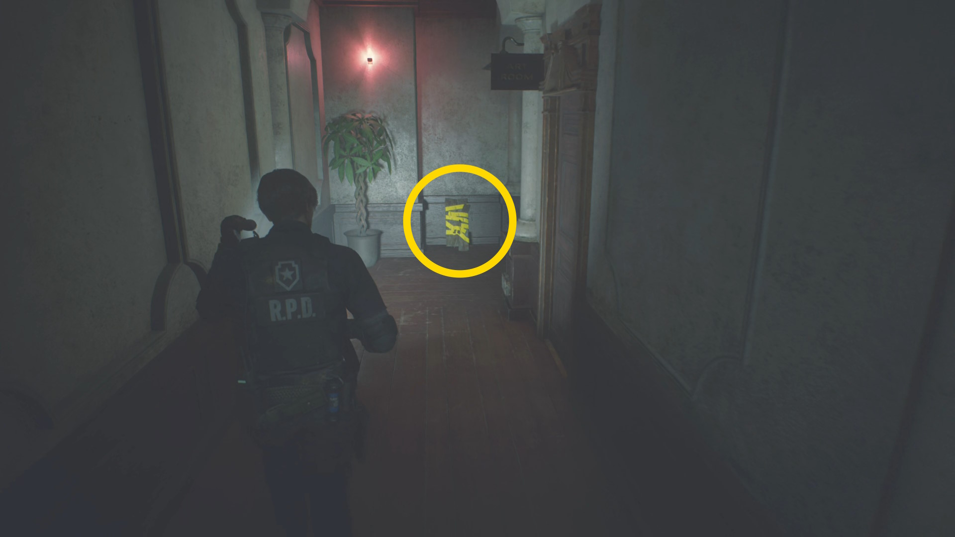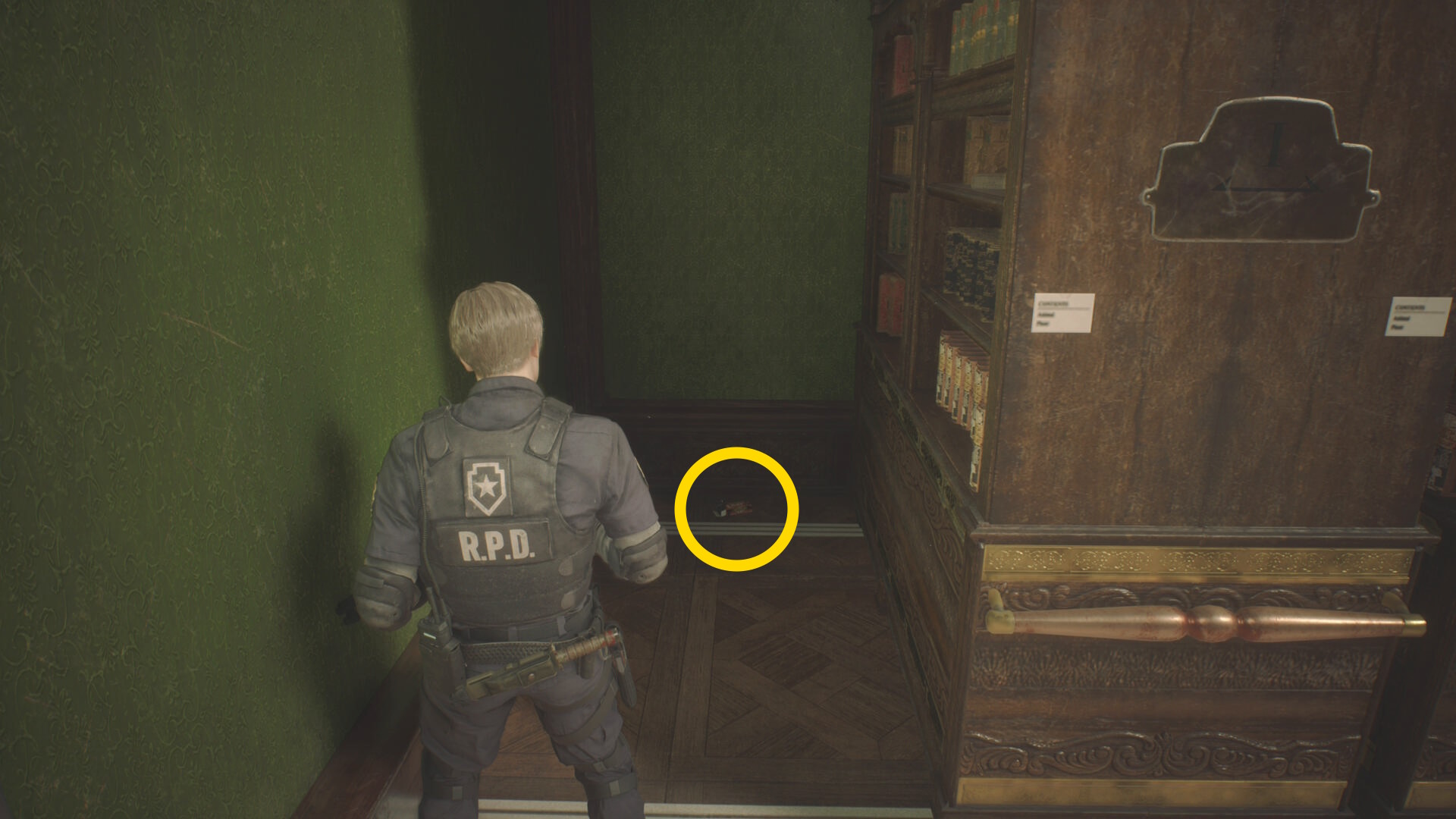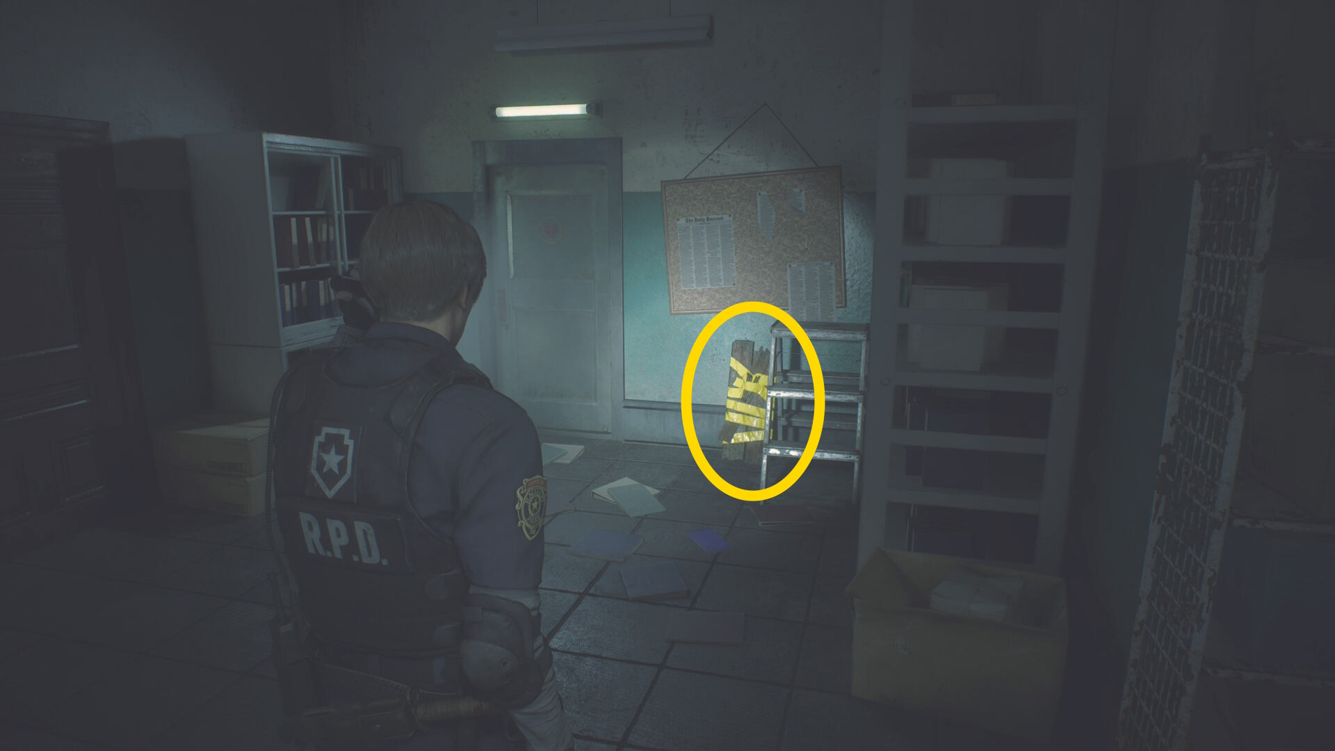 - 資料室のドア(ハートの鍵で解錠:レオンでは開けられない)の右脇にある 木材 を回収